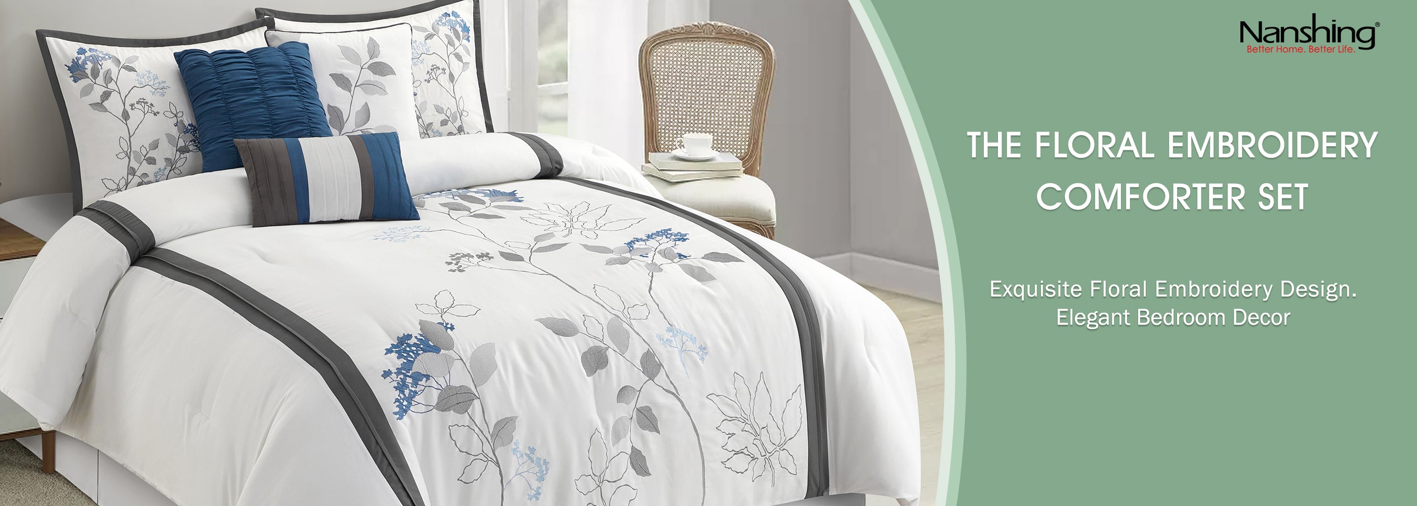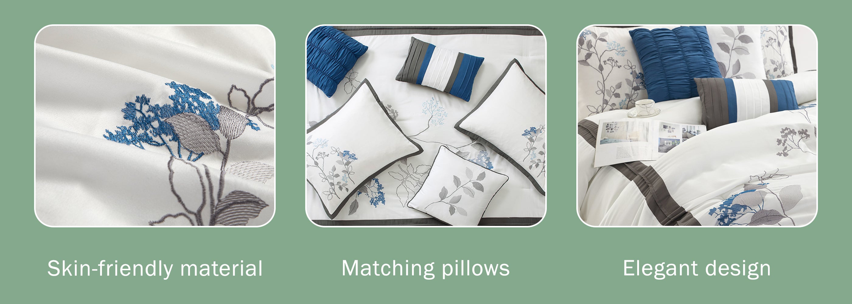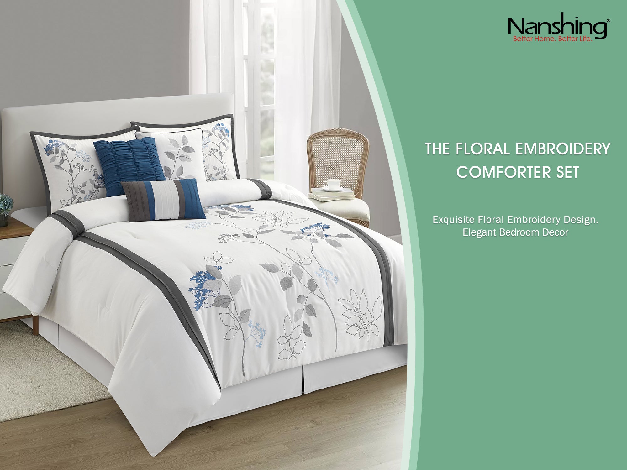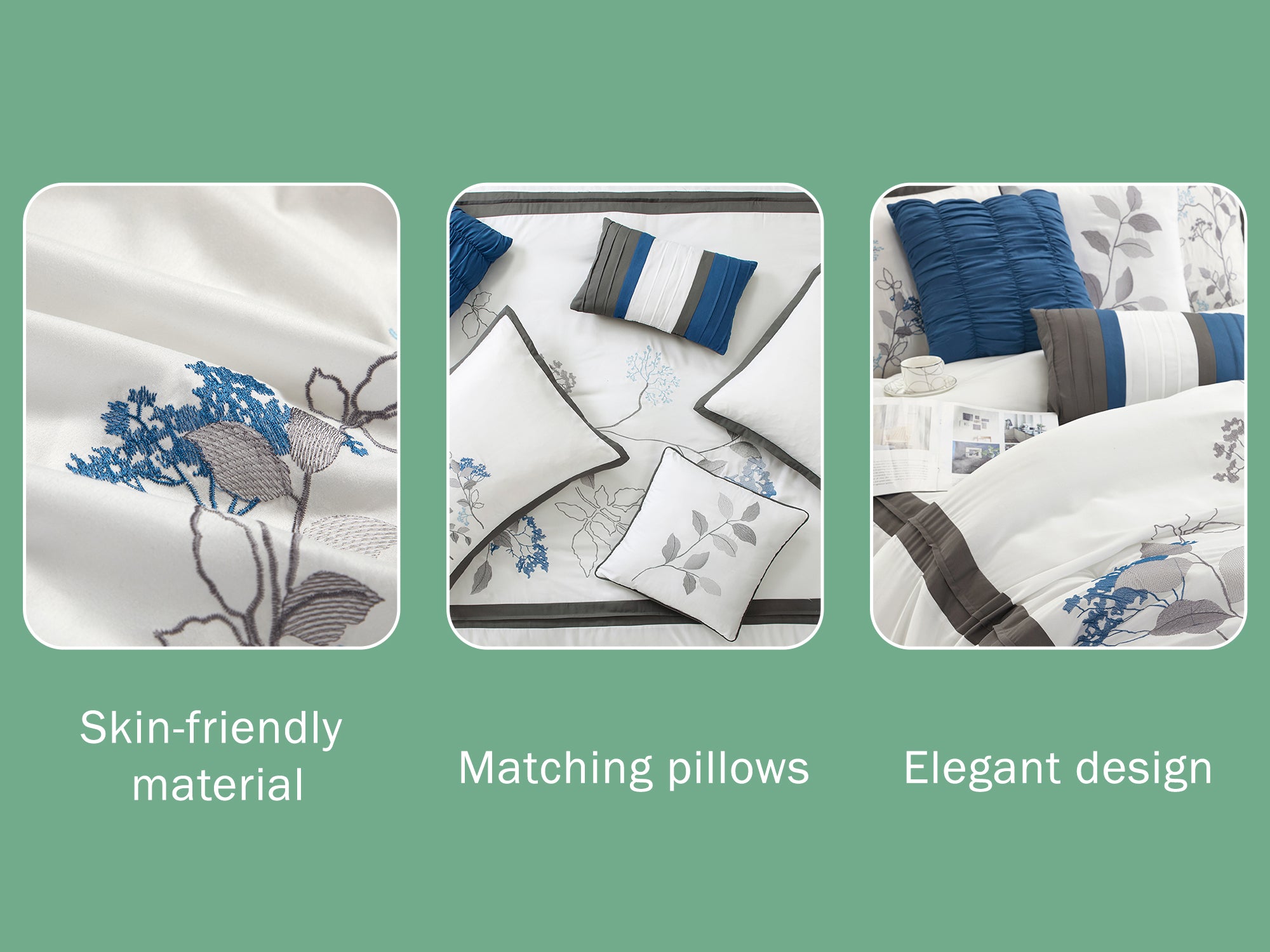 This 7-piece comforter set creates a contemporary and seamless appearance that refreshes your bedroom. Its floral motif accented with shades of navy and grey provides a calming feel and solace in your space. The set consists of one (1) comforter, two (2) matching shams, and one (1) bed skirt. Includes three (3) decorative pillows with a delicate ruffled stitching and beautiful flower-patterned design to complete the look. With polyester fabric and filling, this comforter set is easy to toss in the washing machine and tumble dry.