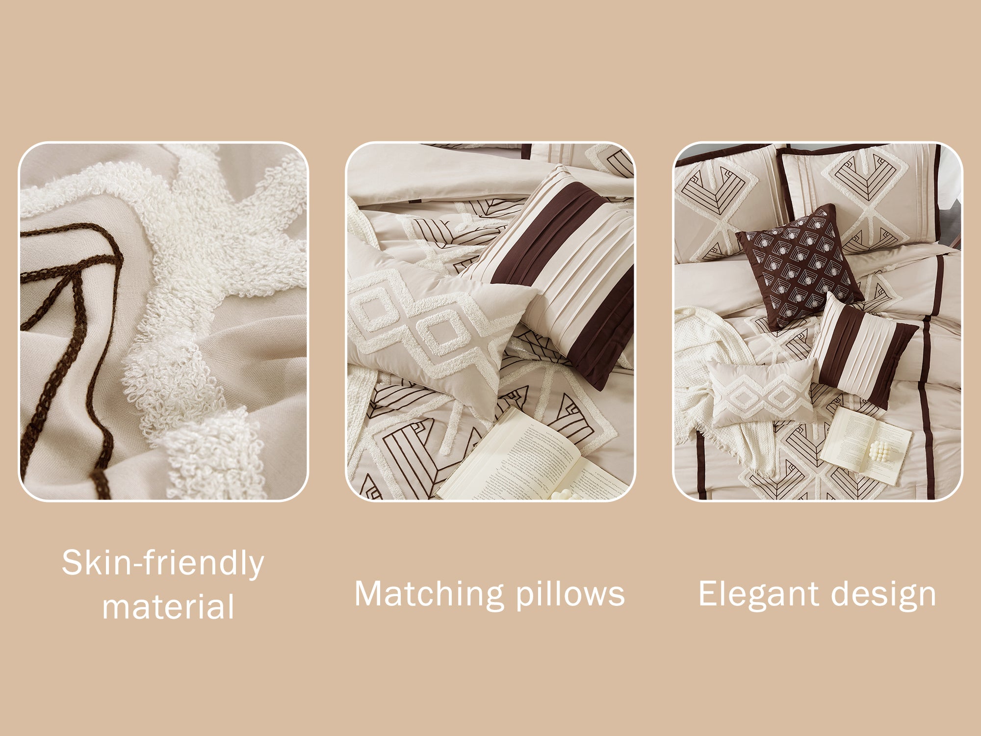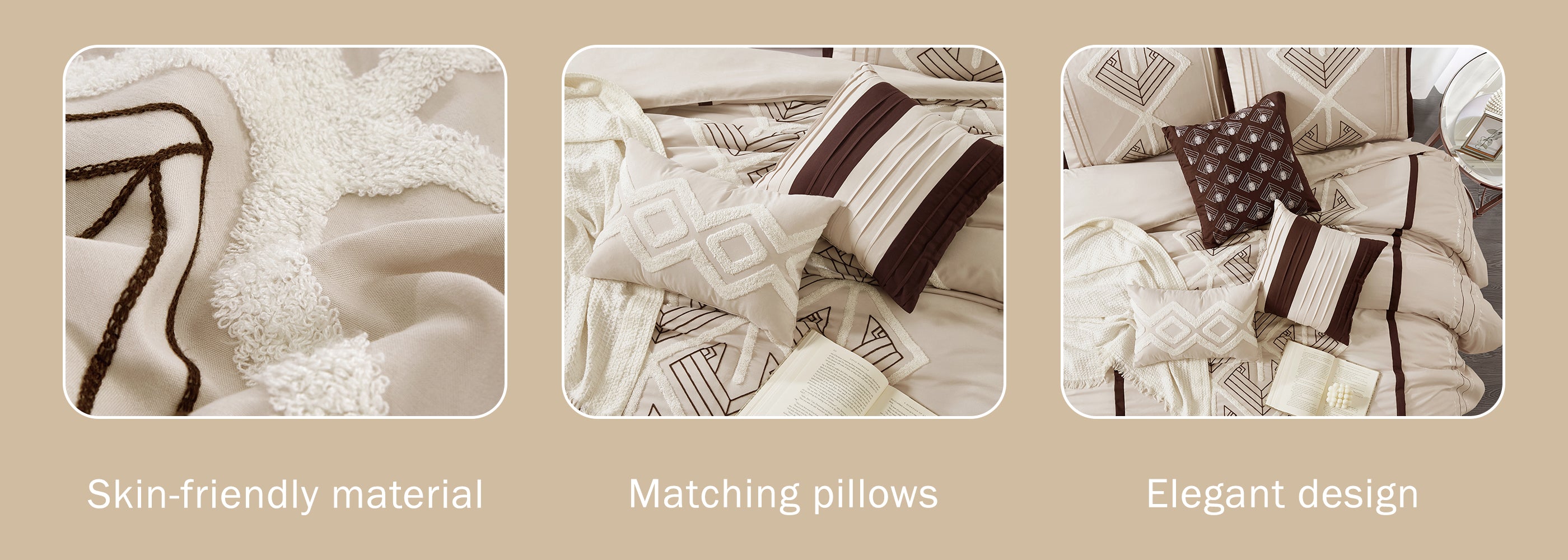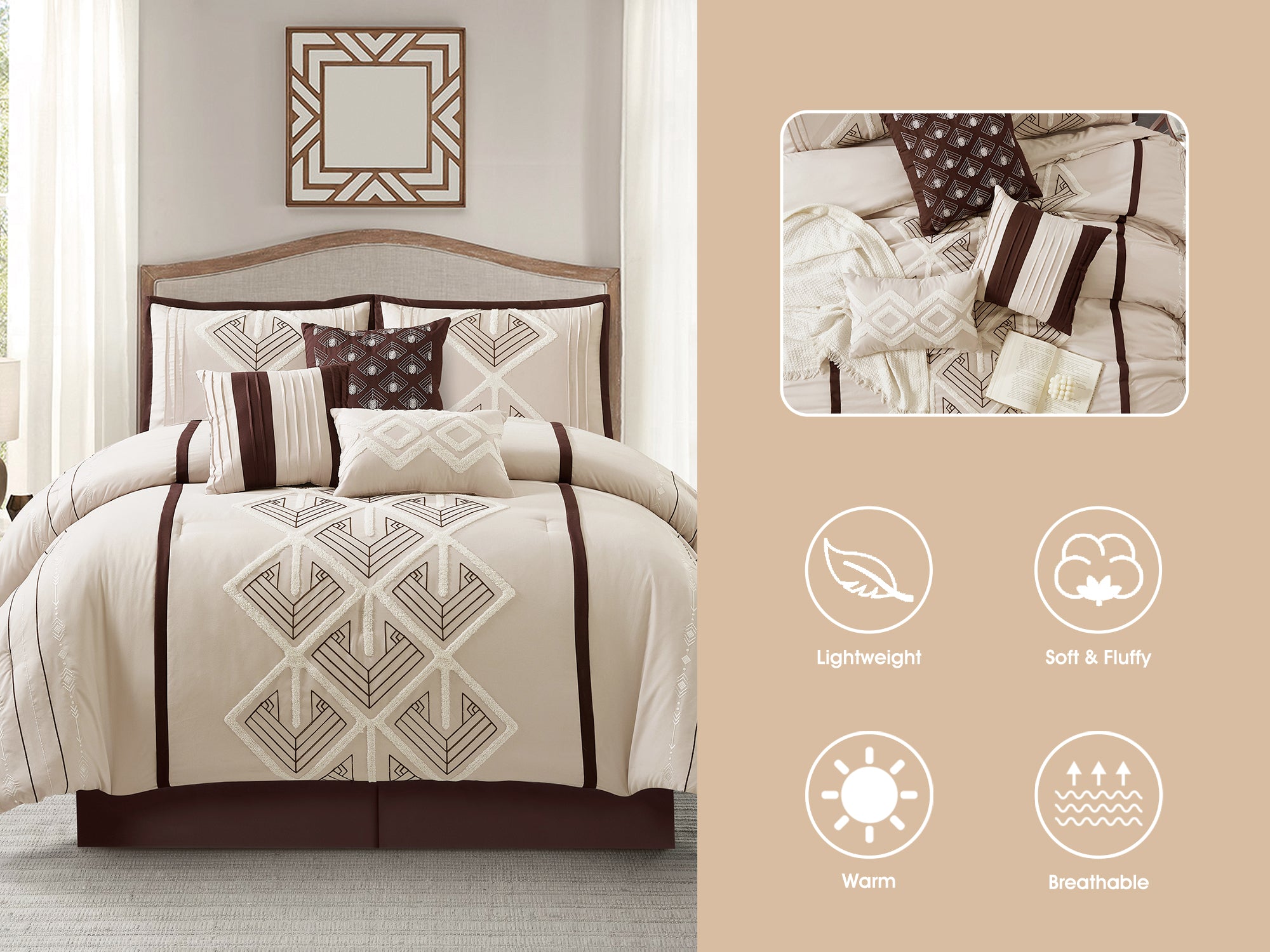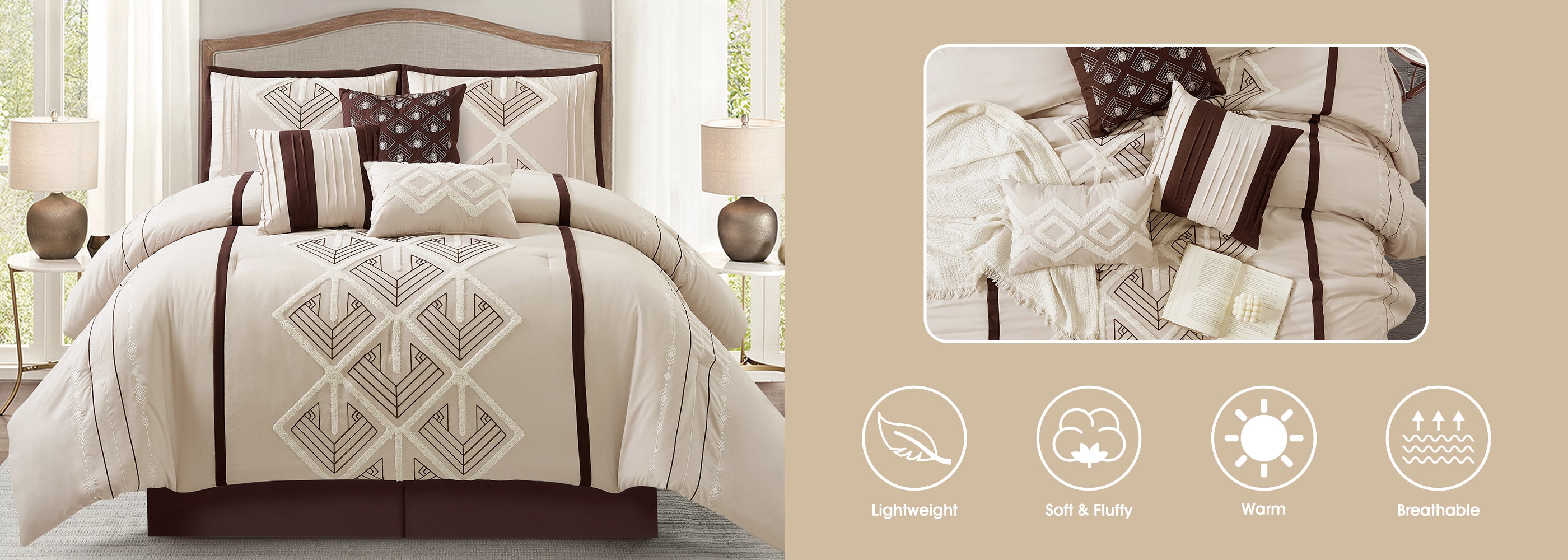 Set Includes: (1) Comforter, (2) Shams, (1) Bed skirt, (3) Decorative Pillows