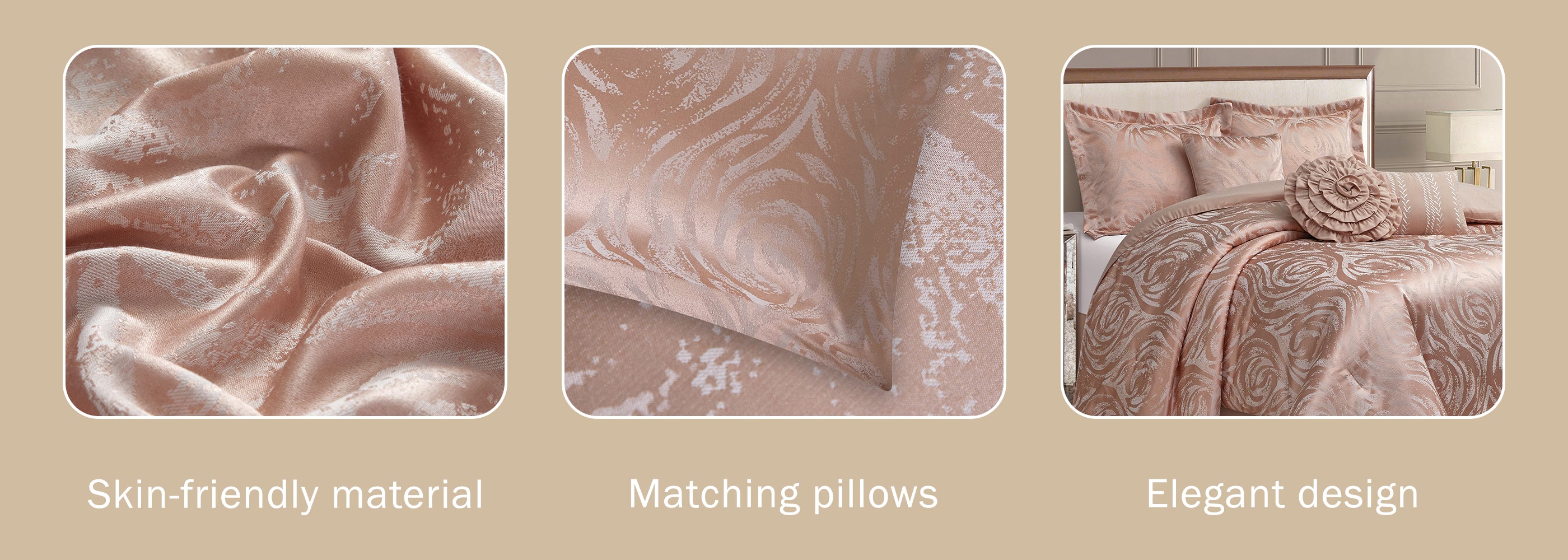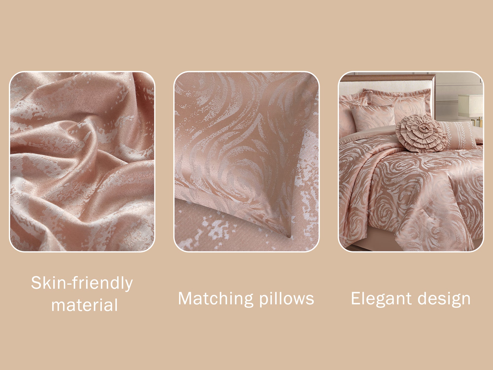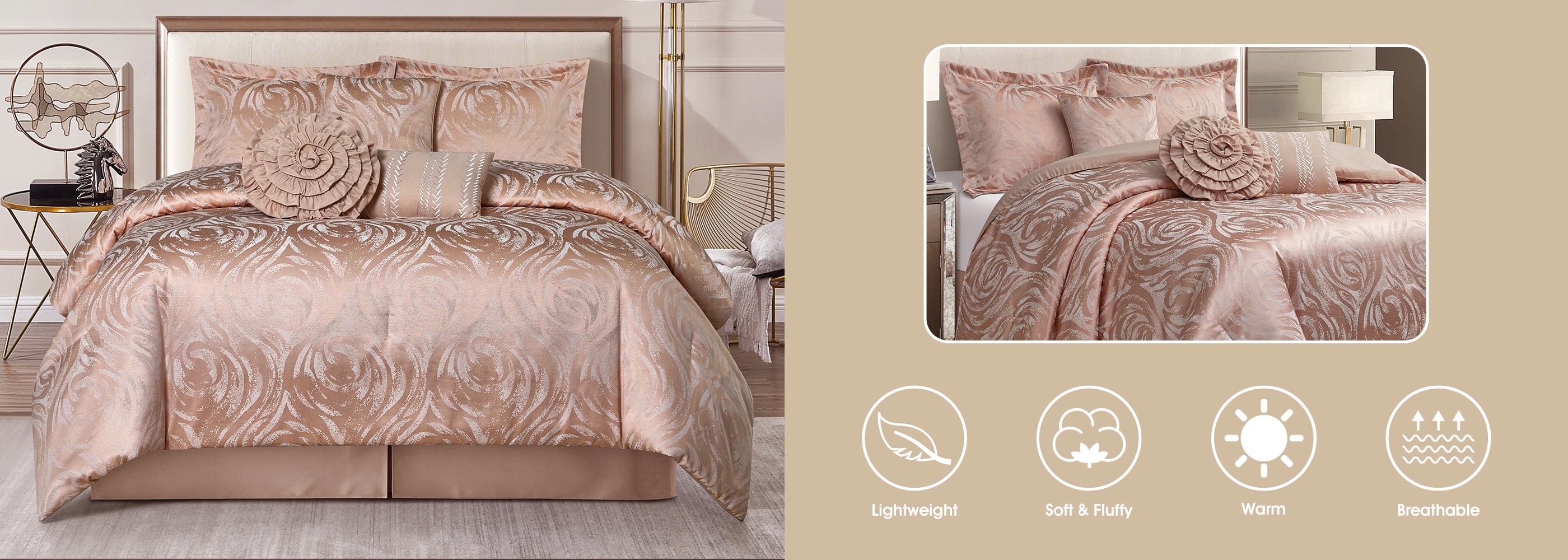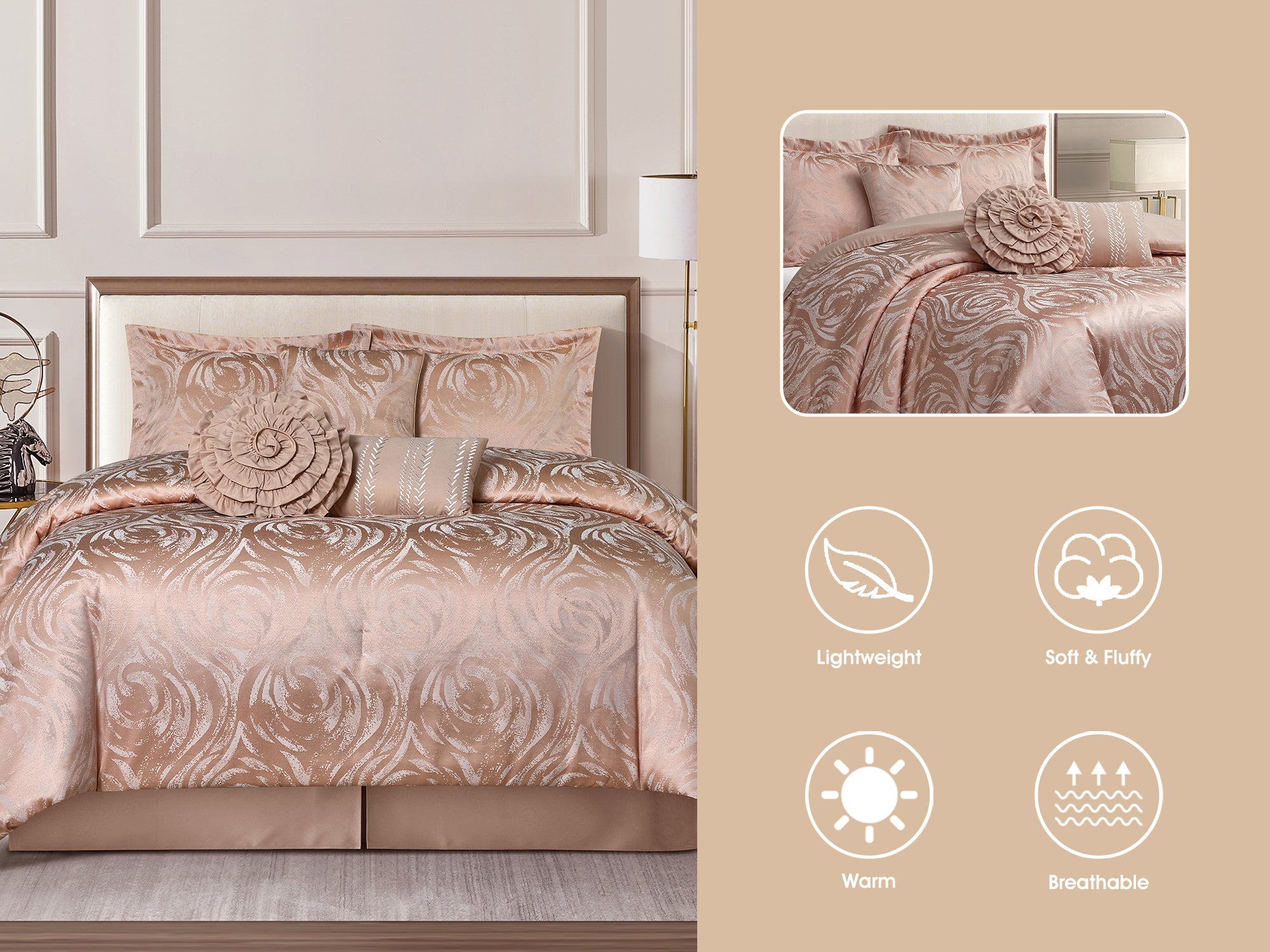 This stunning comforter set, featuring a jacquard rose-inspired design, effortlessly elevates your bedroom decor with a touch of glamour. Its vibrant color complements a range of decorating styles, making it the perfect choice for homeowners with refined tastes in home decoration. Crafted from super-soft, durable, and fade-resistant material, this bedding set is not only machine washable but also cool and breathable, ensuring a warm and comfortable night's sleep. The lightweight comforter's smooth texture makes it suitable for individuals of all ages and ideal for year-round use.