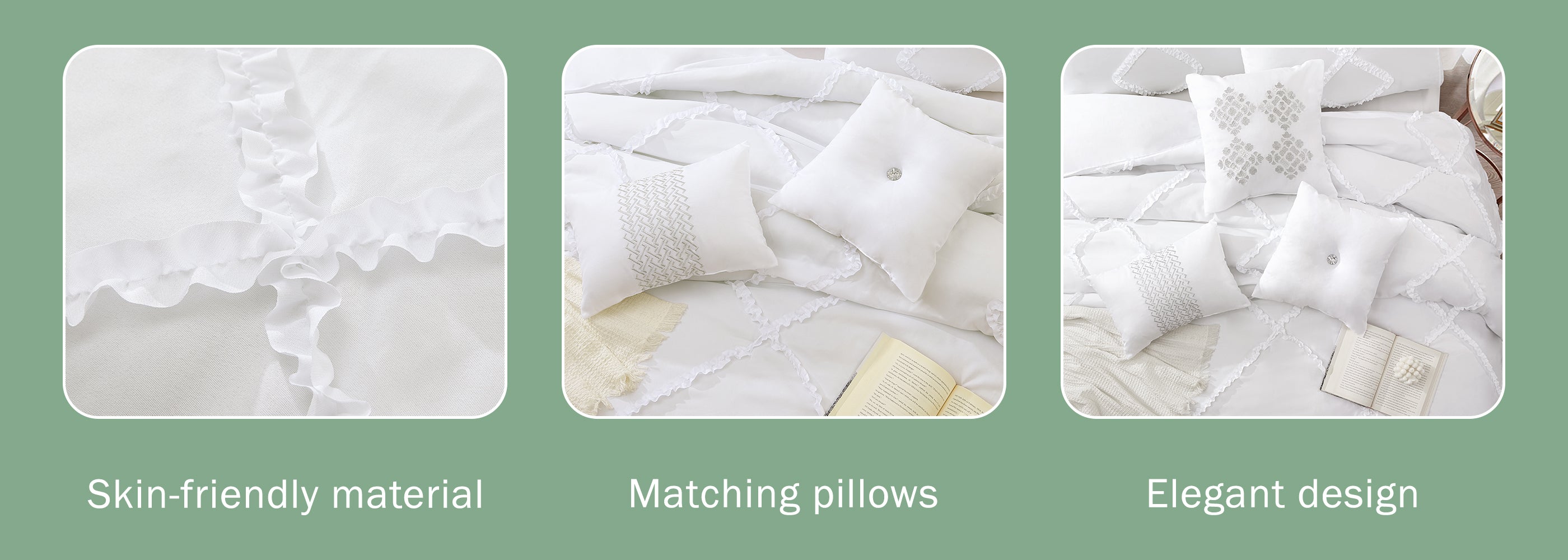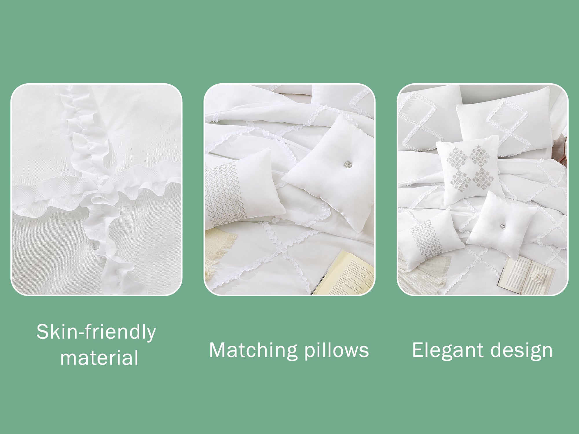 Set Includes:(1) Comforter, (2) Shams, (1) Bed skirt, (3) Decorative Pillows