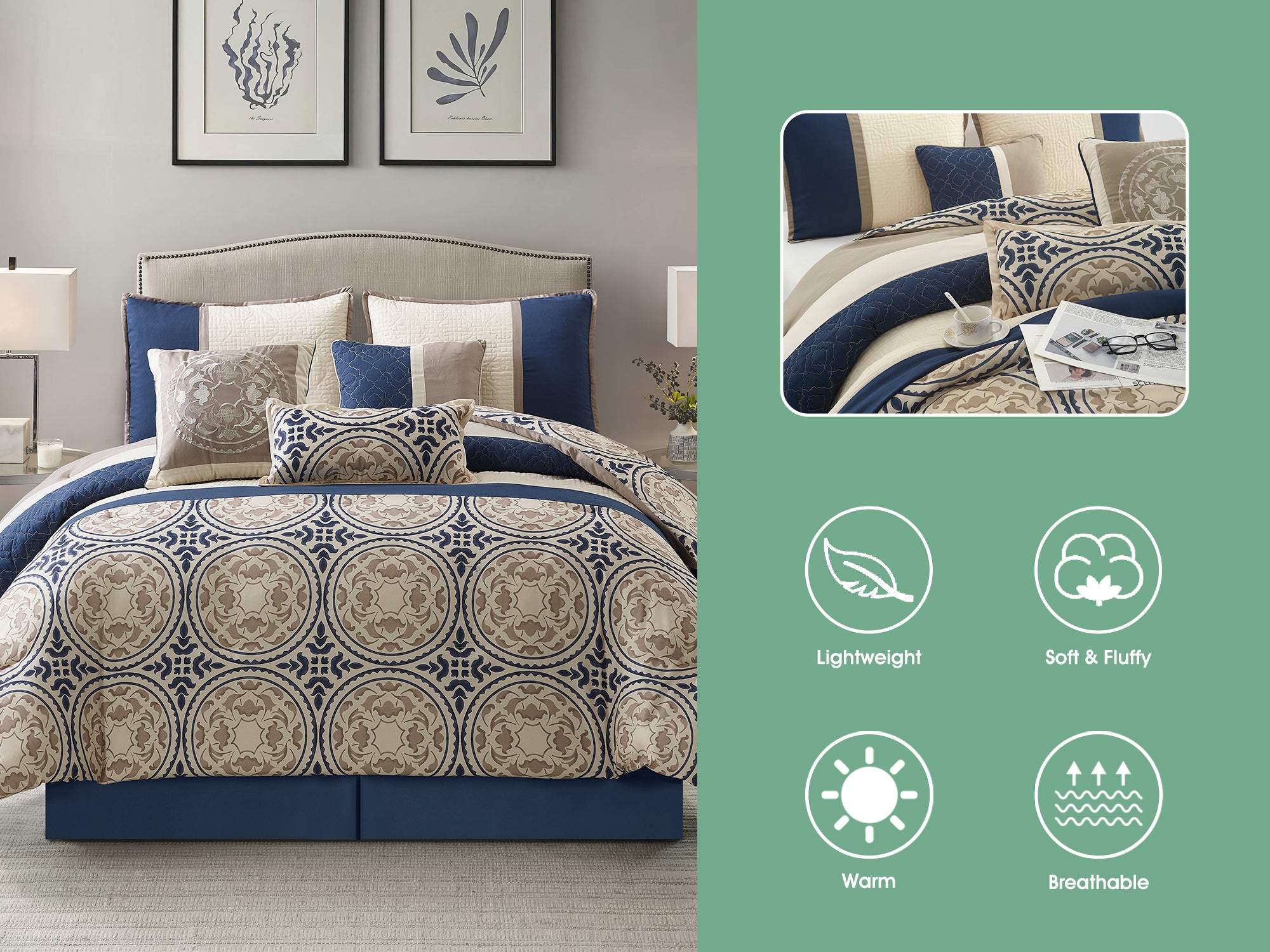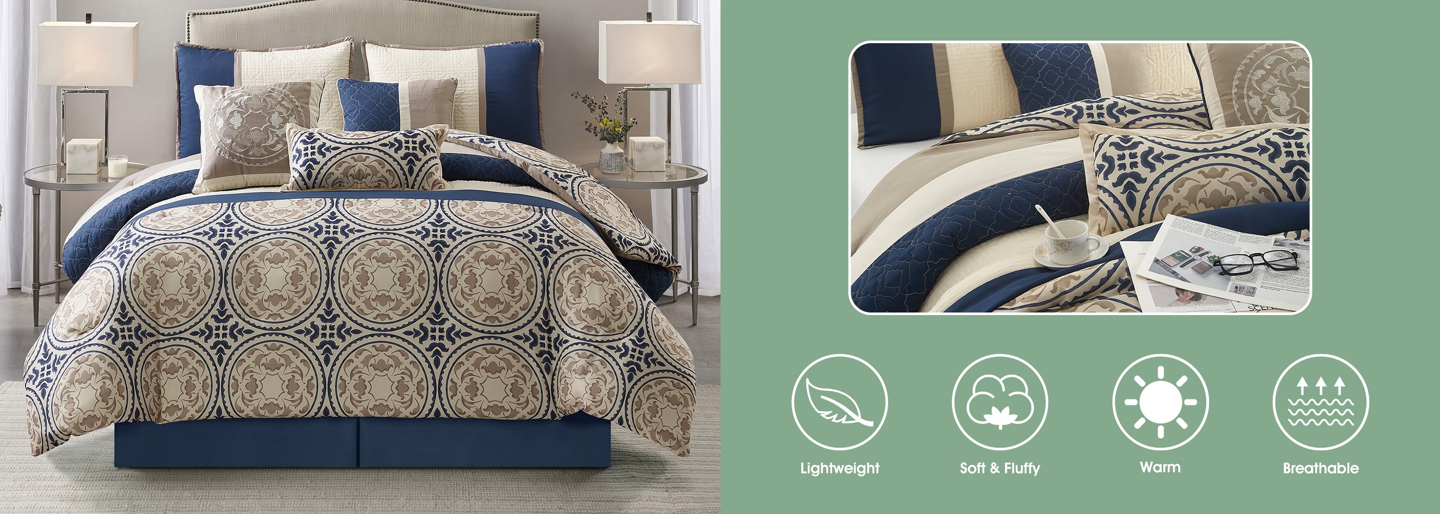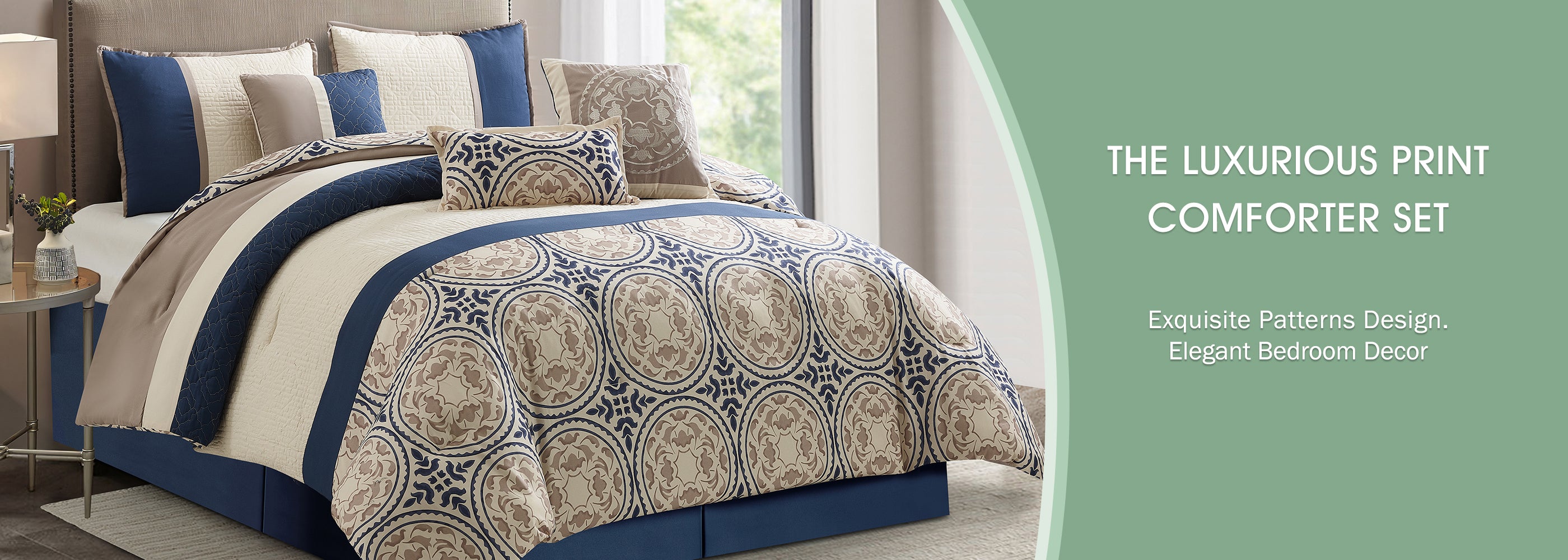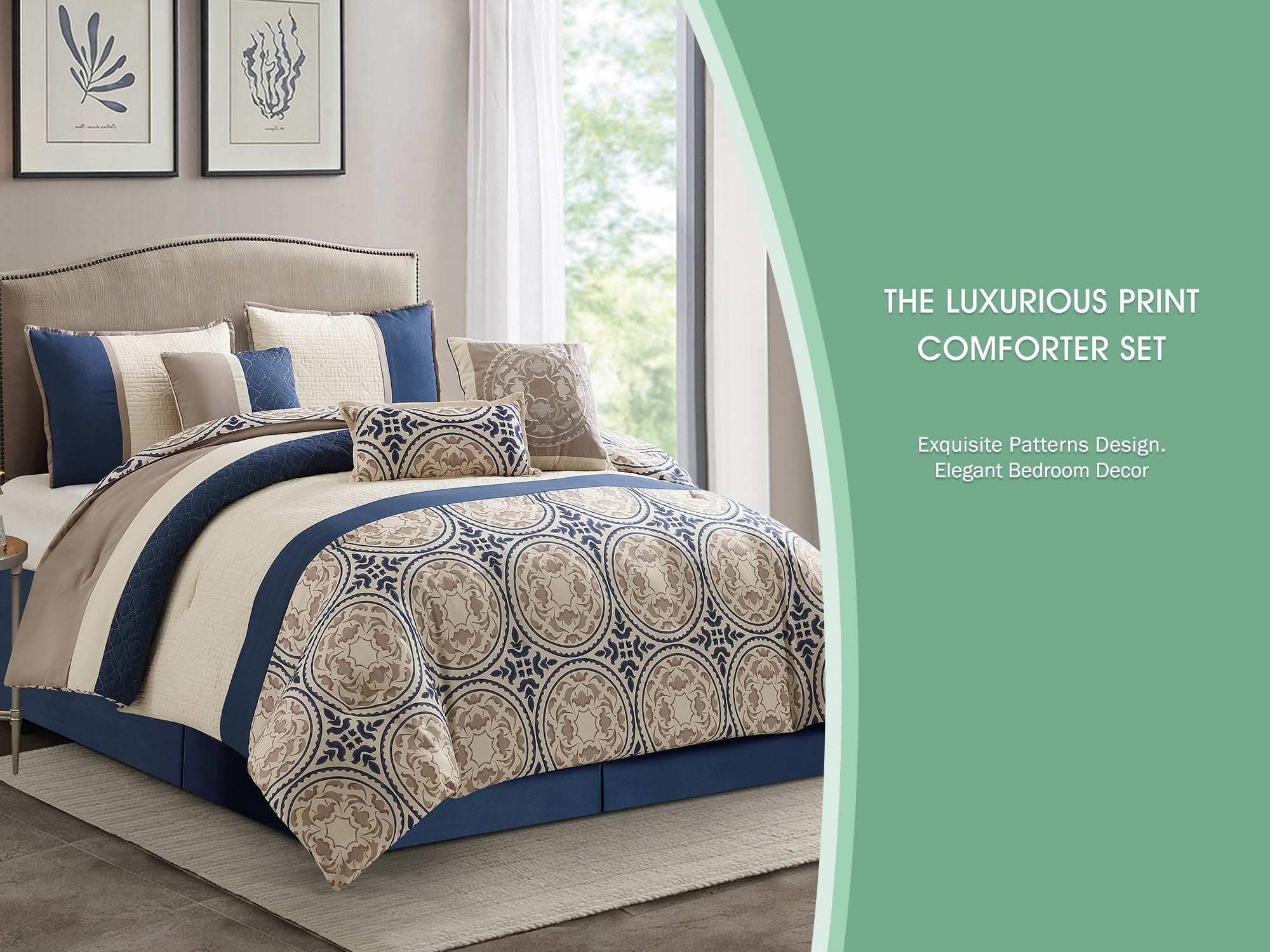 Add a unique touch to your bedroom with this "Large Medallion" print comforter ensemble in soothing neutral shades. This seven-piece set includes everything you will need to outfit your bed with style. With this top quality and affordable bedding collection you will find yourself getting a restful night of sleep all year long.