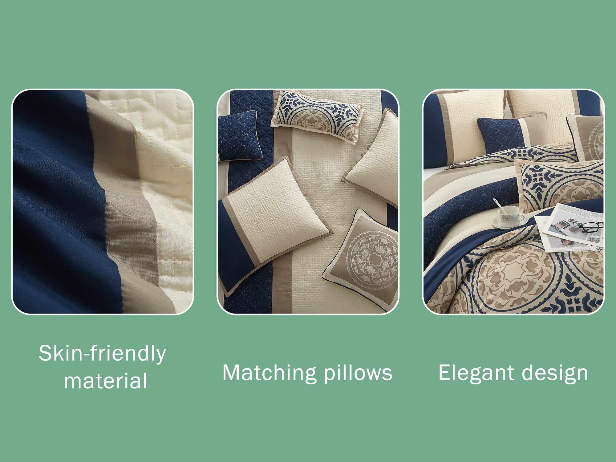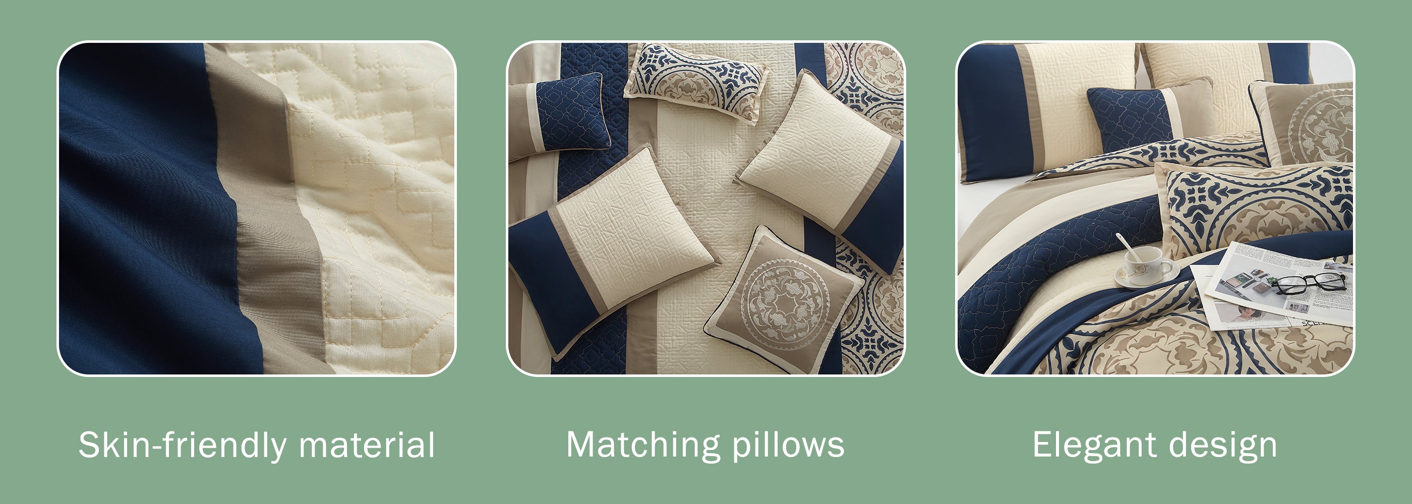 Set Includes: (1) Comforter, (2) Shams, (1) Bed skirt, (3) Decorative Pillows