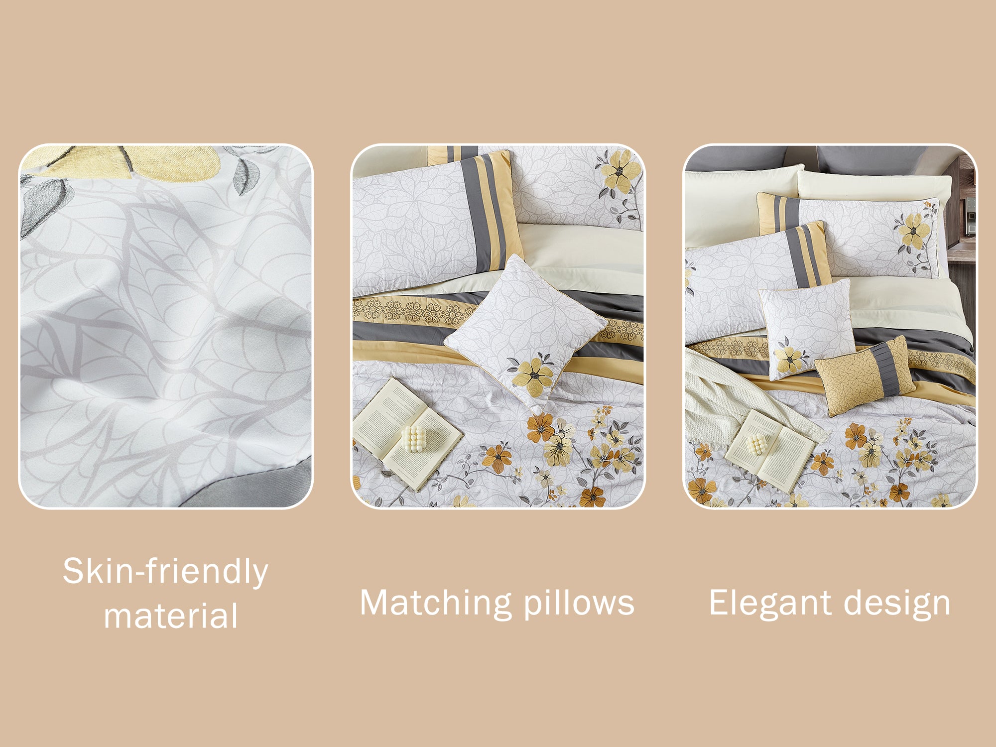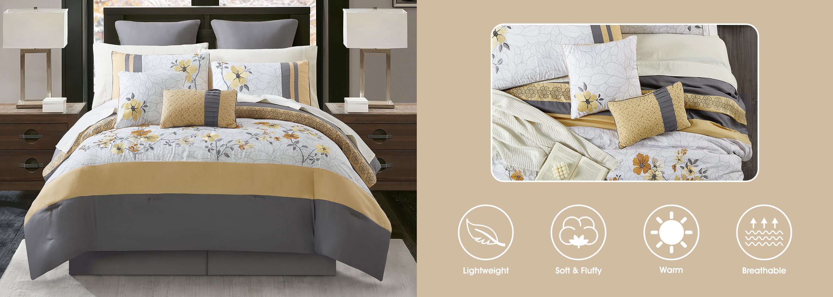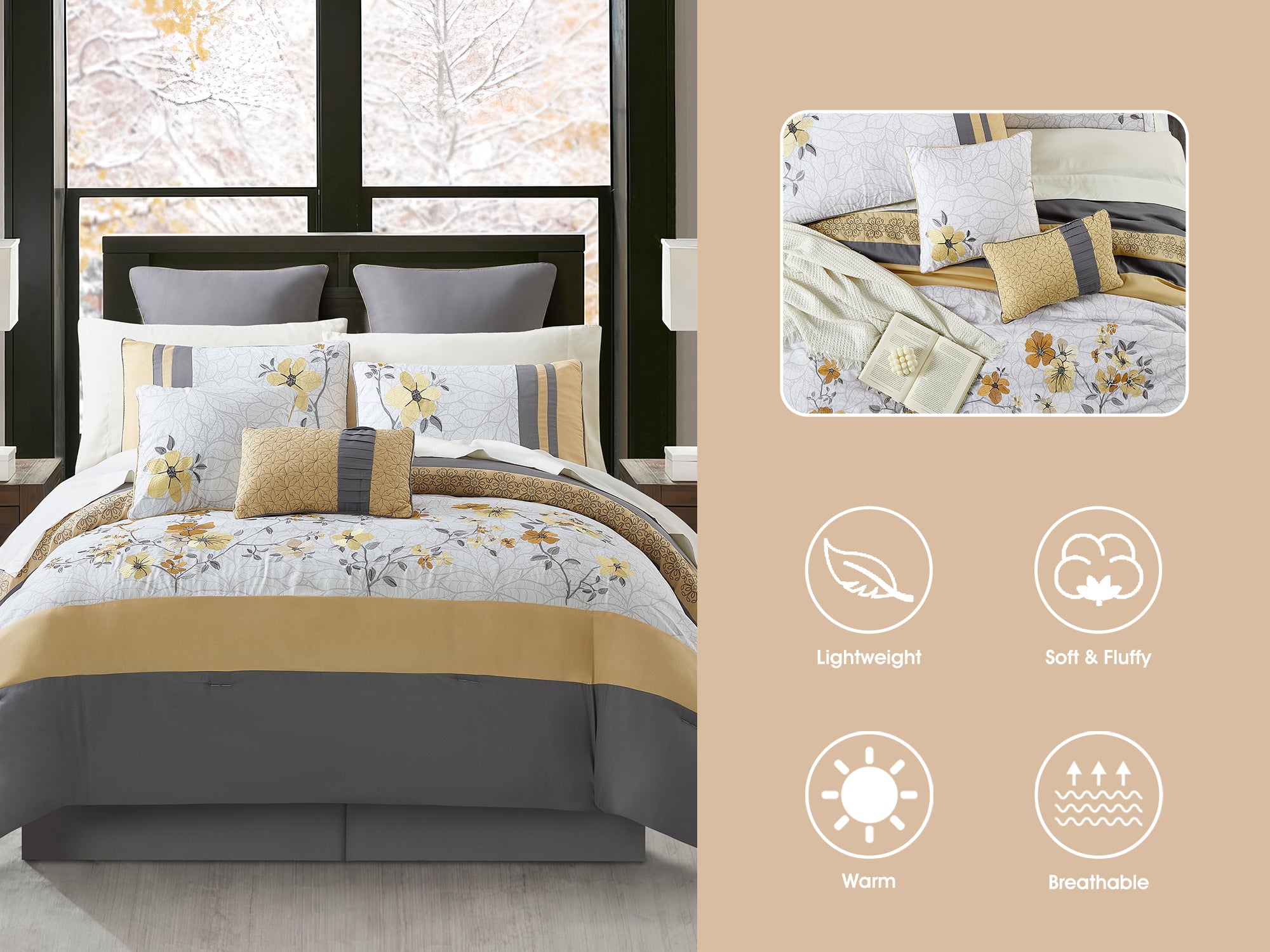 Candice 12-Piece Floral Comforter Set, Grey/Yellow