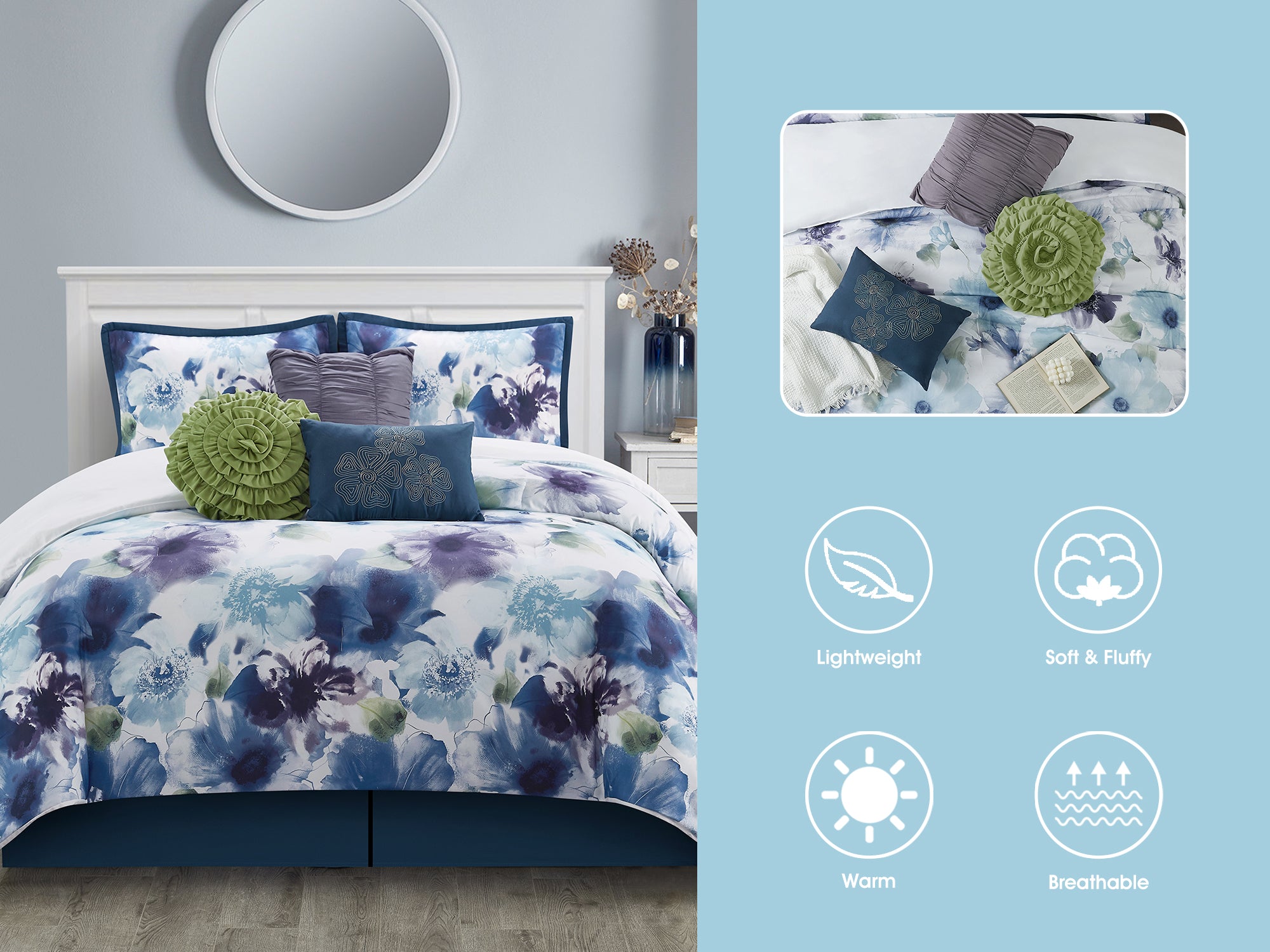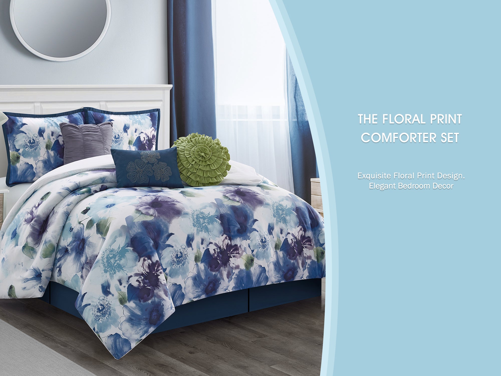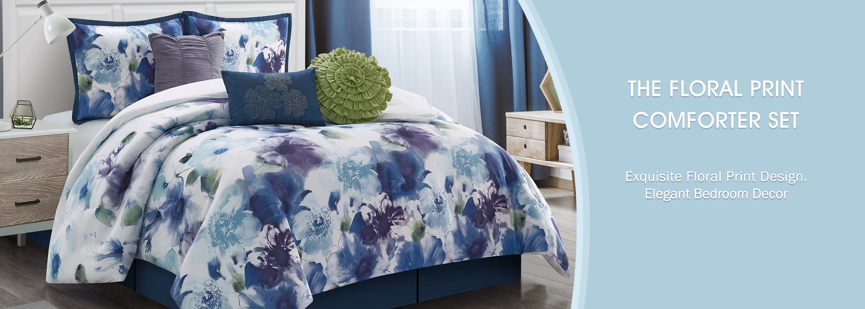 Set Includes: (1) Comforter, (2) Shams, (1) Bed skirt, (3) Decorative Pillows