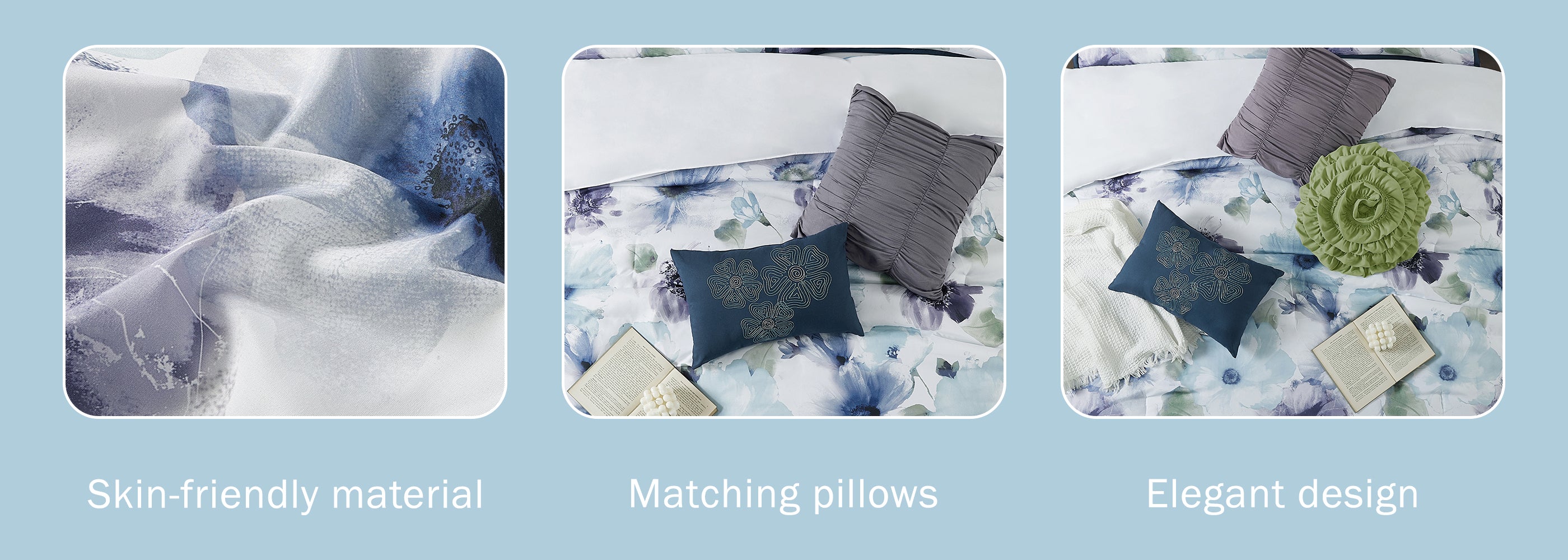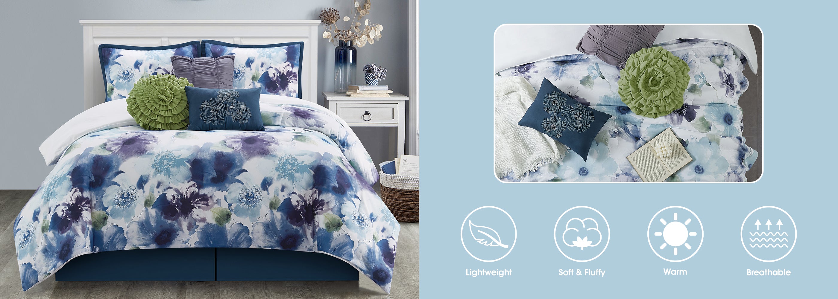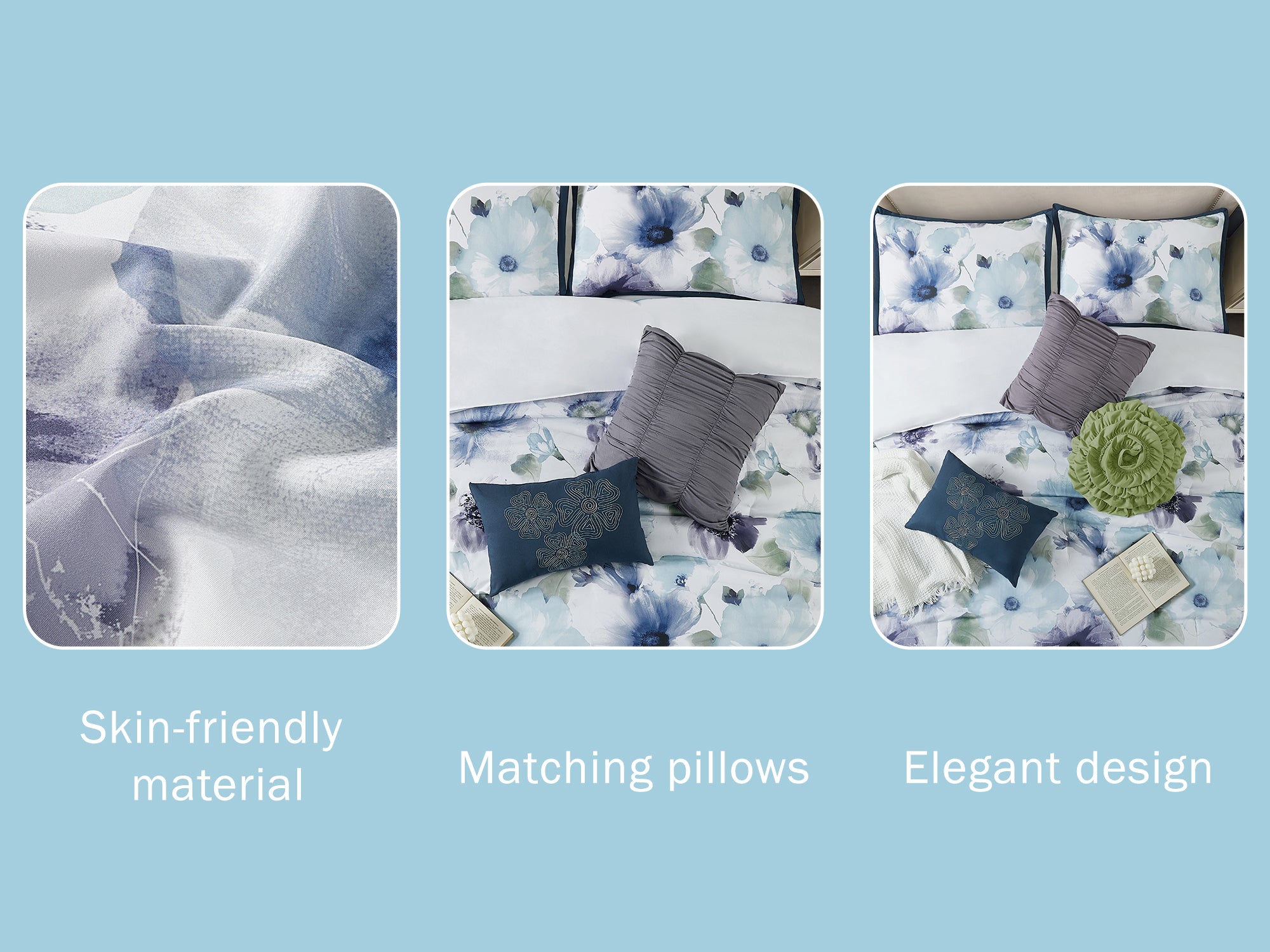 Gorgeous watercolor flowers painting pattern in few blue cast and green colors print. Simple modern gift idea for kids, teens, girls, men or women. The unique design of our comforter set infuses your space with vitality and relaxes you from the stress.