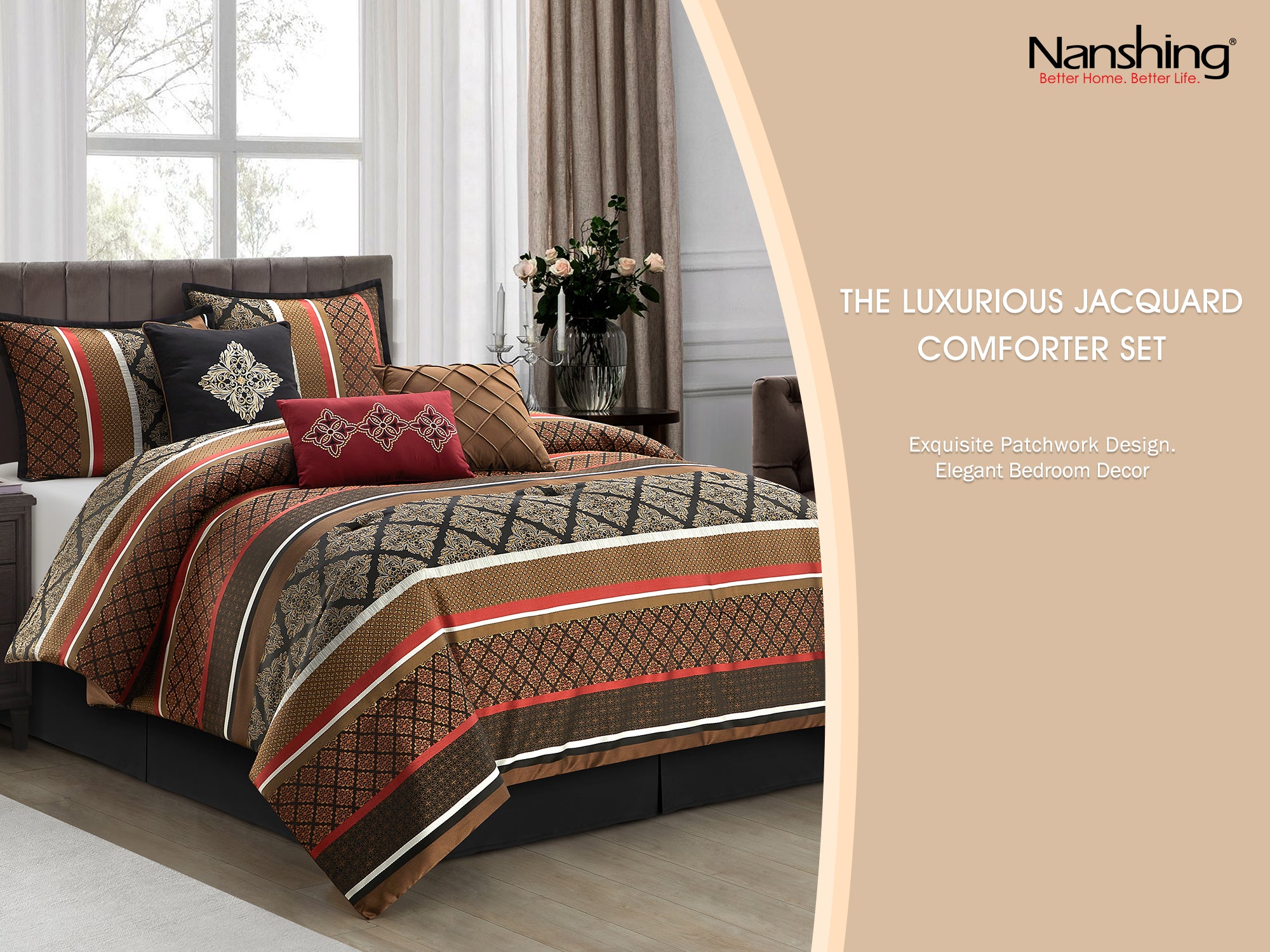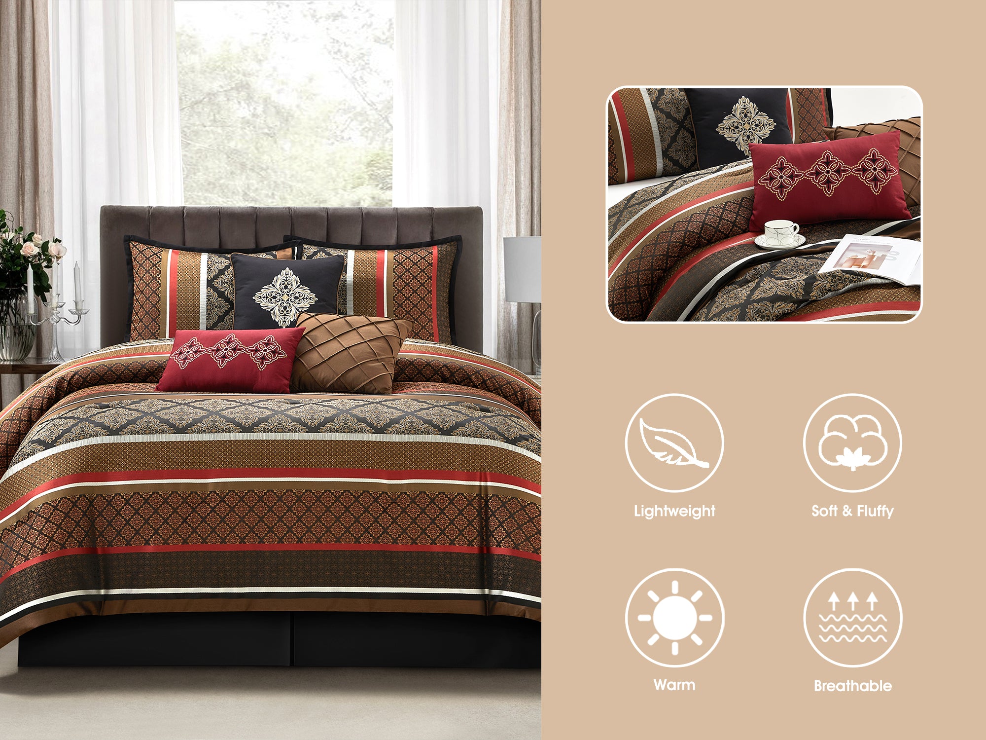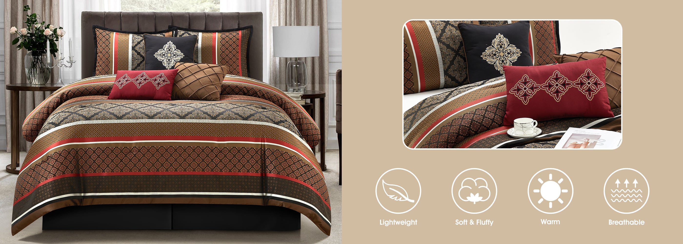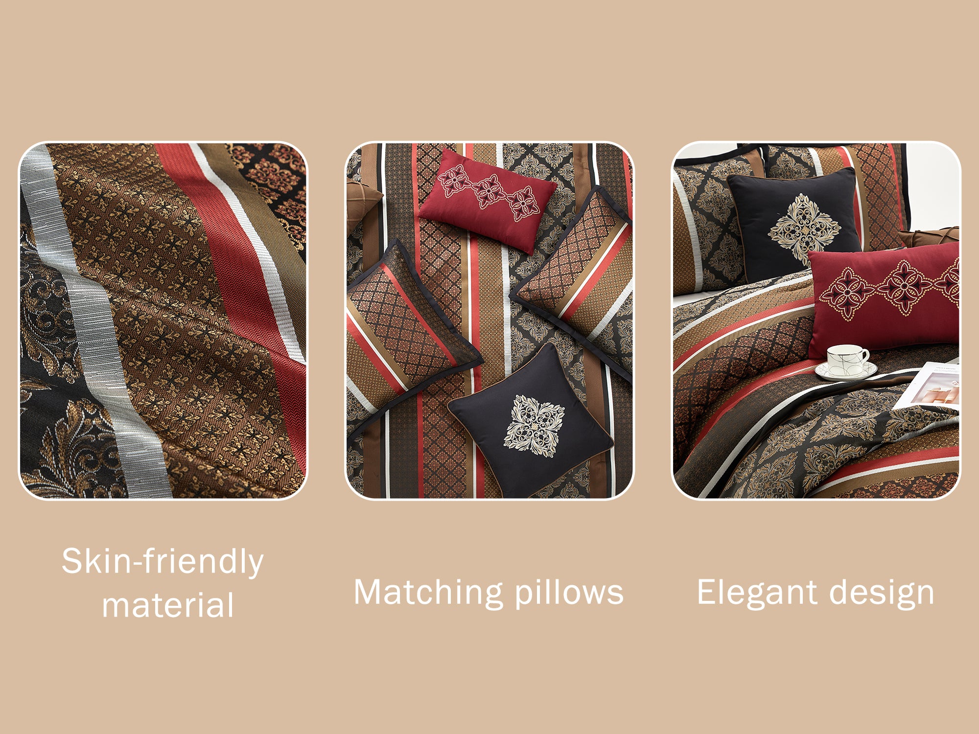 Give your bedroom a modern and luxurious makeover with this beautiful and elegant jacquard comforter set in shades of brown, red and black. The super soft bedding is constructed using a washed process for exceptional softness and long lasting durability. Constructed of 100% polyester fabric and filling, this bed set comes with 1 comforter, 2 shams, 1 bed skirt, and 3 decorative pillows that flaunt excellent workmanship and quality. The complete bed set built to last, this bedding set is made with strict quality control standards and comes with everything you need for a complete bedroom makeover. Made with high strength polyester, this beautiful bedding set can be machine washed and dried on a low tumble setting for easy care.