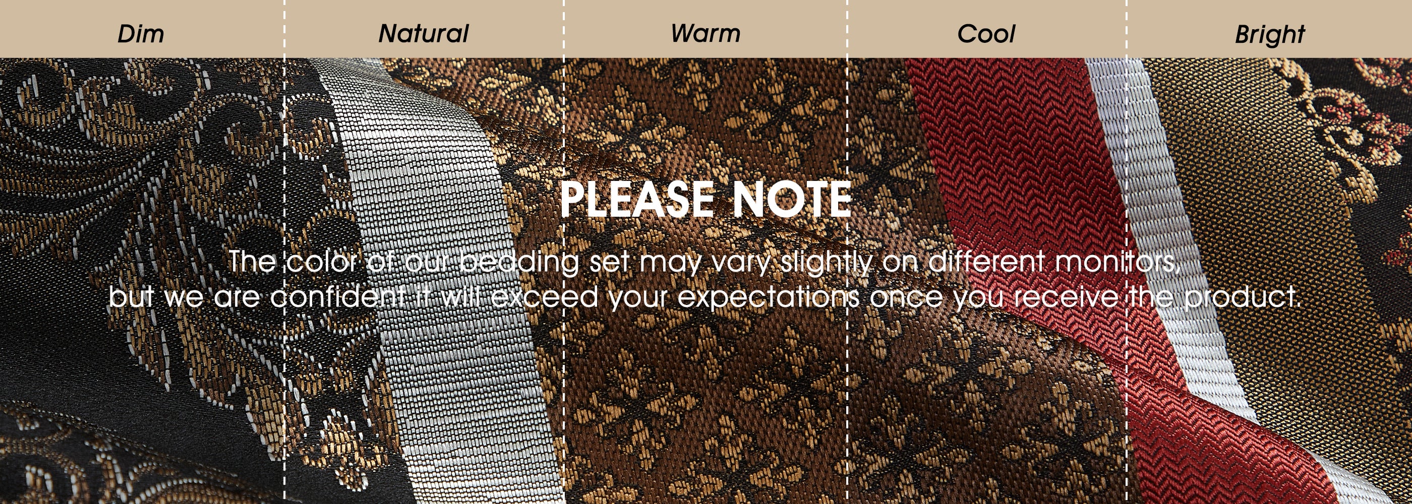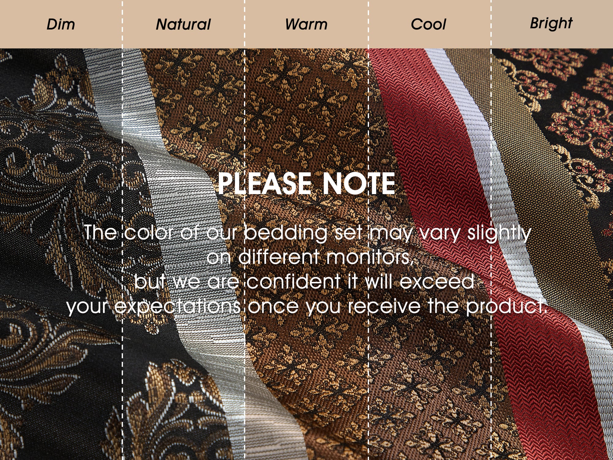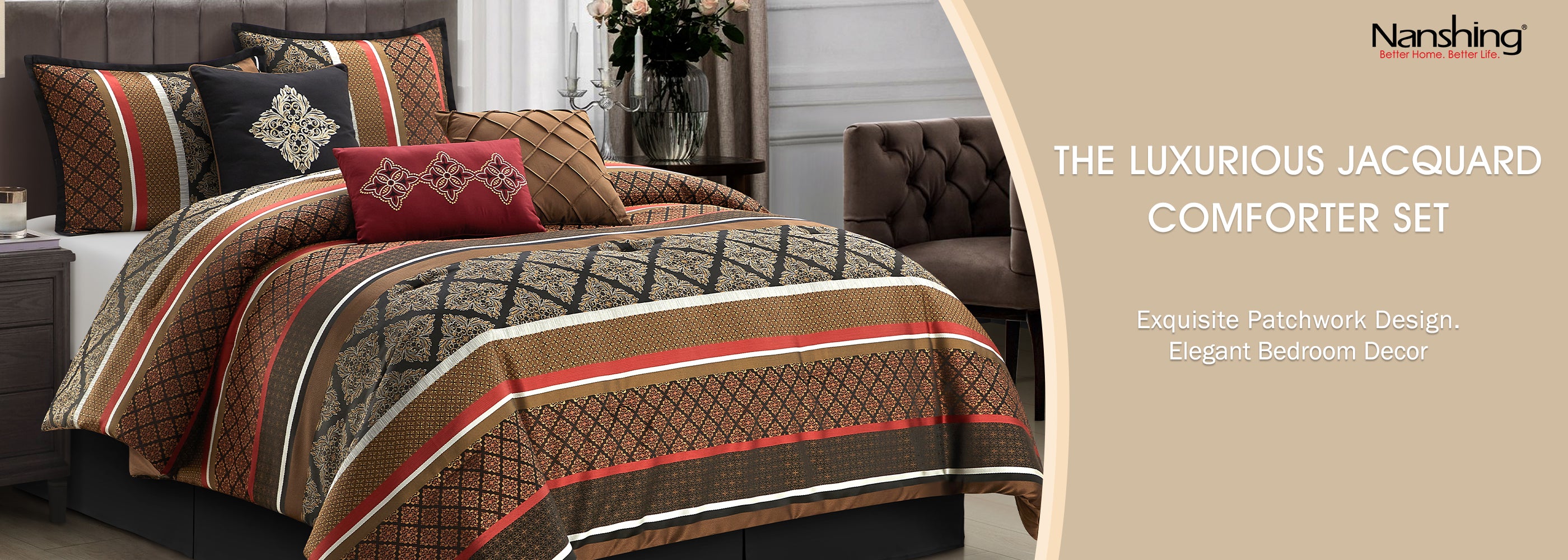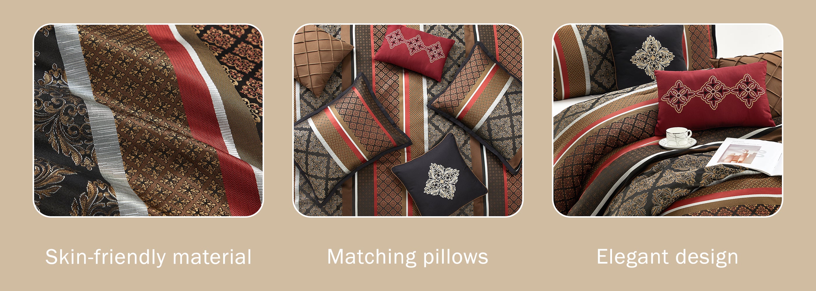 Give your bedroom a modern and luxurious makeover with this beautiful and elegant jacquard comforter set in shades of brown, red and black. The super soft bedding is constructed using a washed process for exceptional softness and long lasting durability. Constructed of 100% polyester fabric and filling, this bed set comes with 1 comforter, 2 shams, 1 bed skirt, and 3 decorative pillows that flaunt excellent workmanship and quality. The complete bed set built to last, this bedding set is made with strict quality control standards and comes with everything you need for a complete bedroom makeover. Made with high strength polyester, this beautiful bedding set can be machine washed and dried on a low tumble setting for easy care.