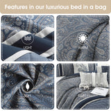 Bring a soft, luxury look to you bedroom with this beautiful 7 piece comforter set. The stylish and beautiful paisley in blue and goldfish tones in combination with contrasting navy and white stripes and quilting on the bottom are guaranteed to elevate your bedroom decor. Constructed of 100% polyester fabric and filling, this bed set comes with one (1) cozy comforter, two (2) shams, one (1) solid bed skirt, and three (3) plushy pillows that flaunt excellent workmanship and quality. The complete bed set built to last, this bedding set is made with strict quality control standards and comes with everything you need for a complete bedroom makeover. Made with high strength polyester, this beautiful bedding set can be machine washed and dried on a low tumble setting for easy care.