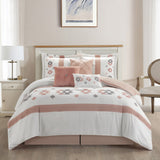 Turn your bedroom into a slumber retreat with this beautiful and elegant comforter set featuring terry embroidery creating a 3D look in soft ivory accented with blush. Constructed of 100% polyester fabric and filling, this bed set comes with 1 comforter, 2 shams, 1 bed skirt, and 3 decorative pillows that flaunt excellent workmanship and quality. The complete bed set built to last, this bedding set is made with strict quality control standards and comes with everything you need for a complete bedroom makeover. Made with high strength polyester, this beautiful bedding set can be machine washed and dried on a low tumble setting for easy care.