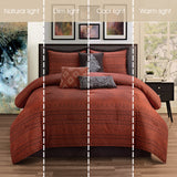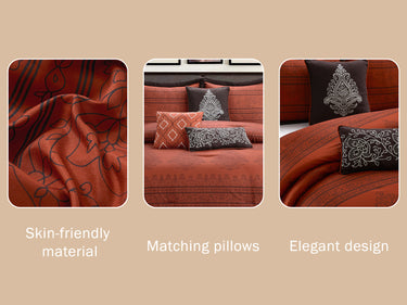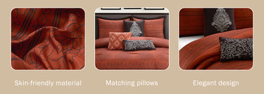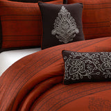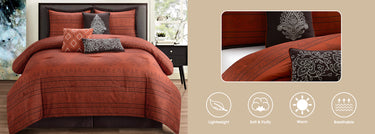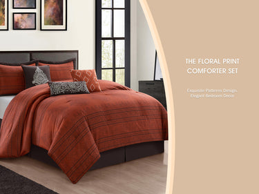 Create a perfect blend of elegance and comfort for your bedroom sanctuary with this exquisite 7-piece comforter set. This set features a captivating combination of damask and stripe patterns, creating a visually stunning focal point. Crafted from premium microfiber fabric, it offers a sumptuously soft touch while ensuring durability and easy maintenance. The warm and inviting rust hue adds a touch of sophistication to any décor, making it an ideal choice for both contemporary and traditional settings.