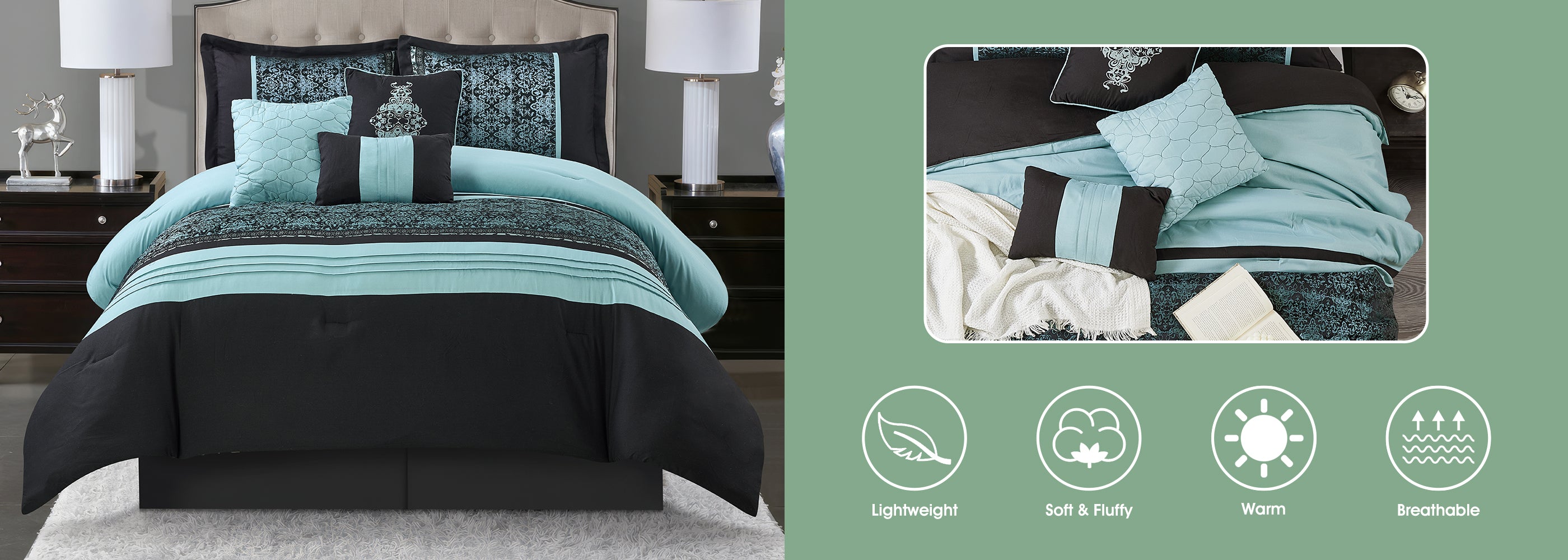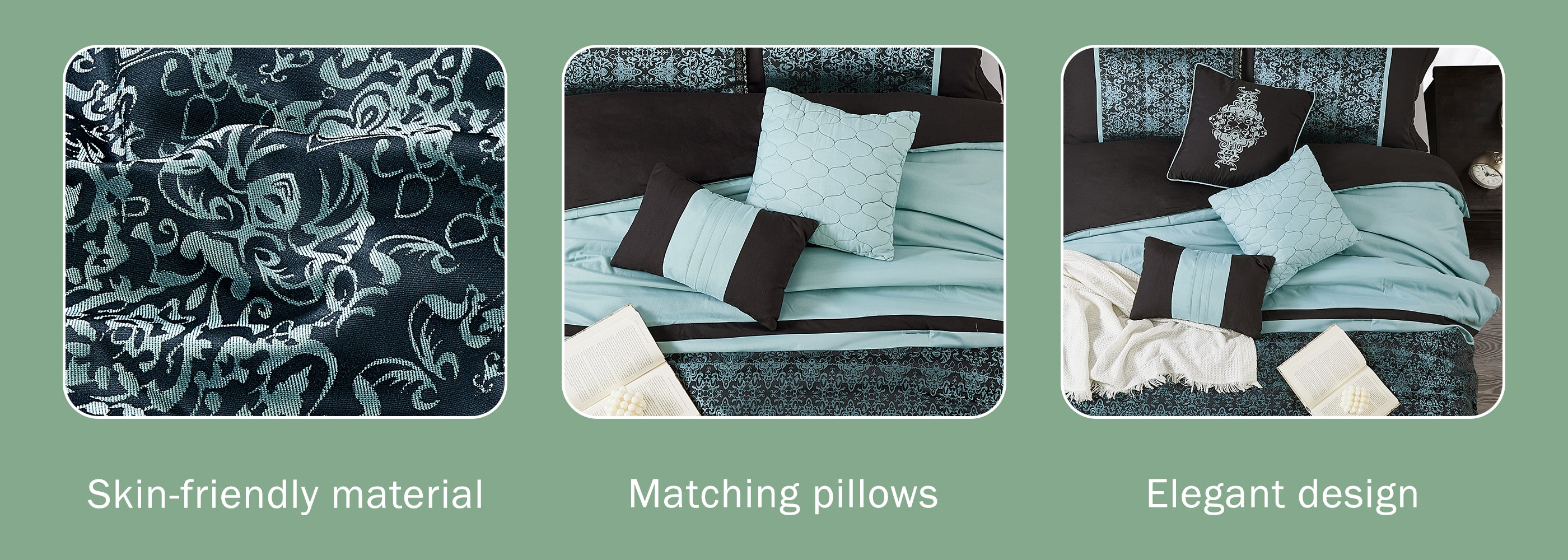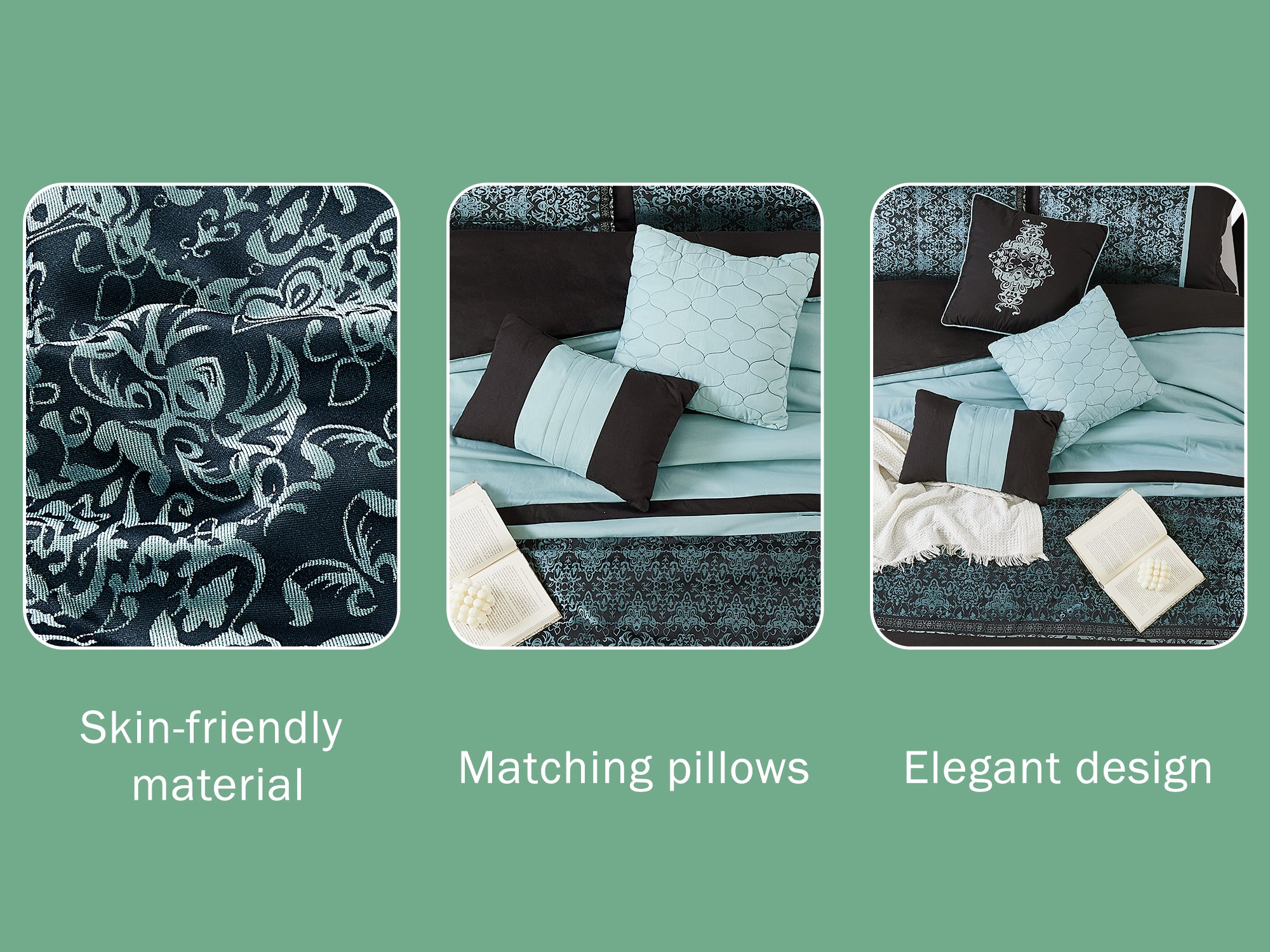 Bring a global elegance to your bedroom with this beautiful comforter set that combines a damask jacquard with solid accent colors of fresh aqua and onyx for a rich look. Constructed of 100% polyester fabric and filling, this bed set comes with one (1) cozy comforter, two (2) shams, one (1) solid bed skirt, and three (3) plushy pillows that flaunt excellent workmanship and quality. The complete bed set built to last, this bedding set is made with strict quality control standards and comes with everything you need for a complete bedroom makeover. Made with high strength polyester, this beautiful bedding set can be machine washed and dried on a low tumble setting for easy care.