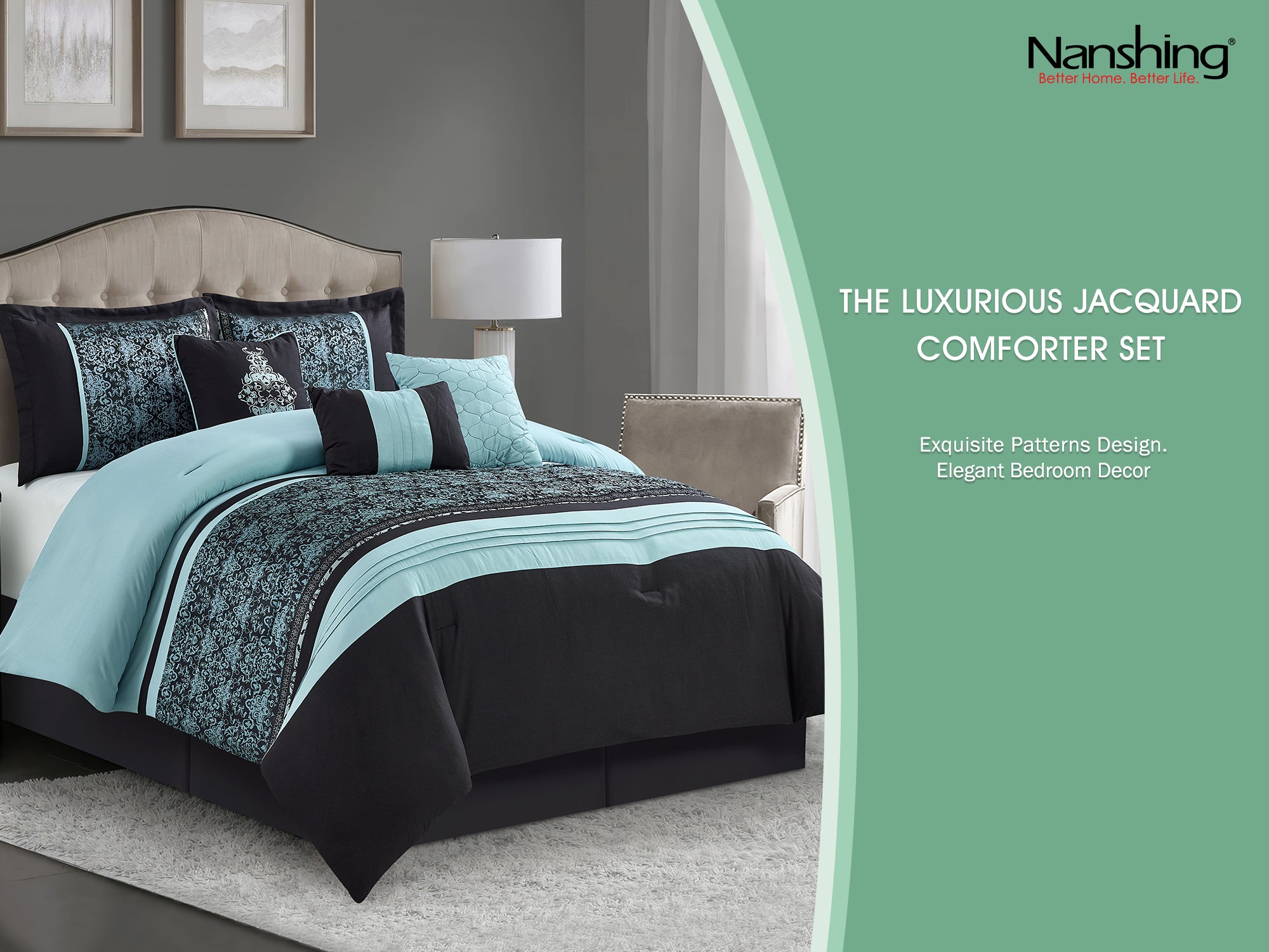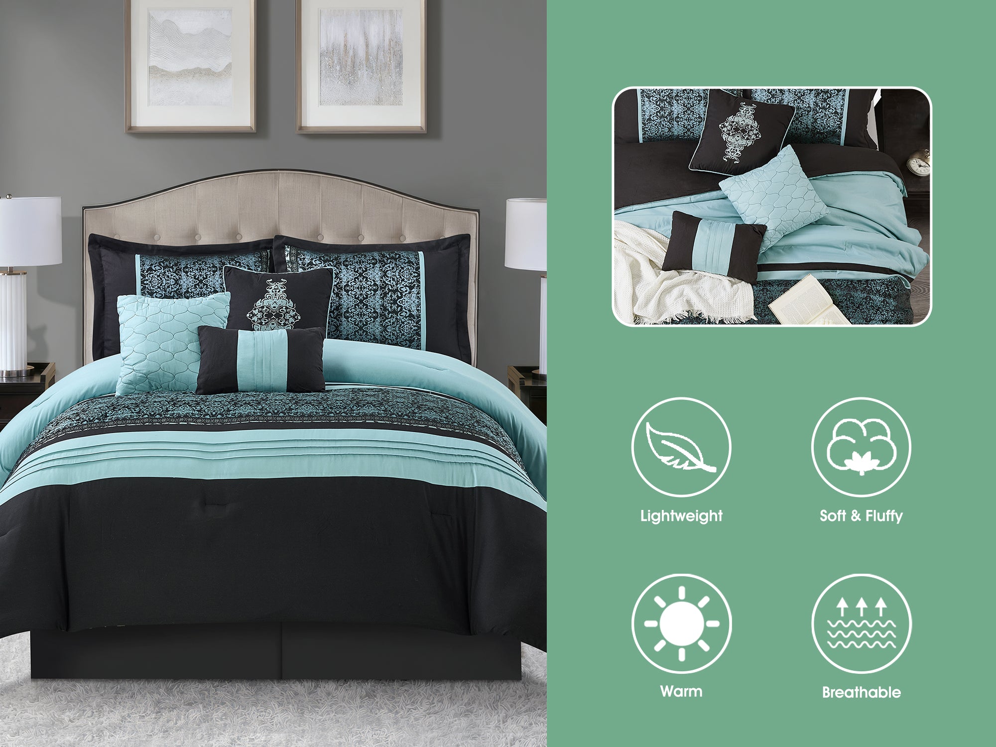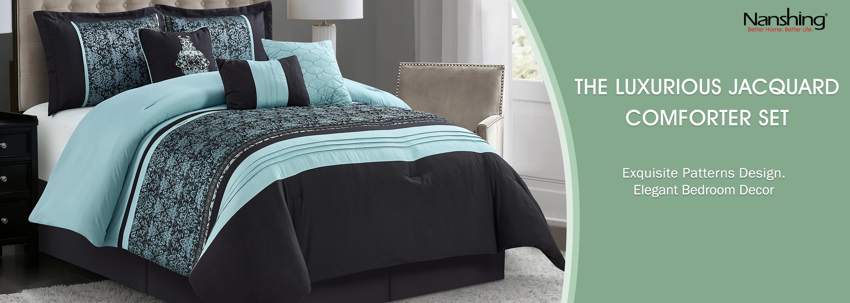 Bring a global elegance to your bedroom with this beautiful comforter set that combines a damask jacquard with solid accent colors of fresh aqua and onyx for a rich look. Constructed of 100% polyester fabric and filling, this bed set comes with one (1) cozy comforter, two (2) shams, one (1) solid bed skirt, and three (3) plushy pillows that flaunt excellent workmanship and quality. The complete bed set built to last, this bedding set is made with strict quality control standards and comes with everything you need for a complete bedroom makeover. Made with high strength polyester, this beautiful bedding set can be machine washed and dried on a low tumble setting for easy care.