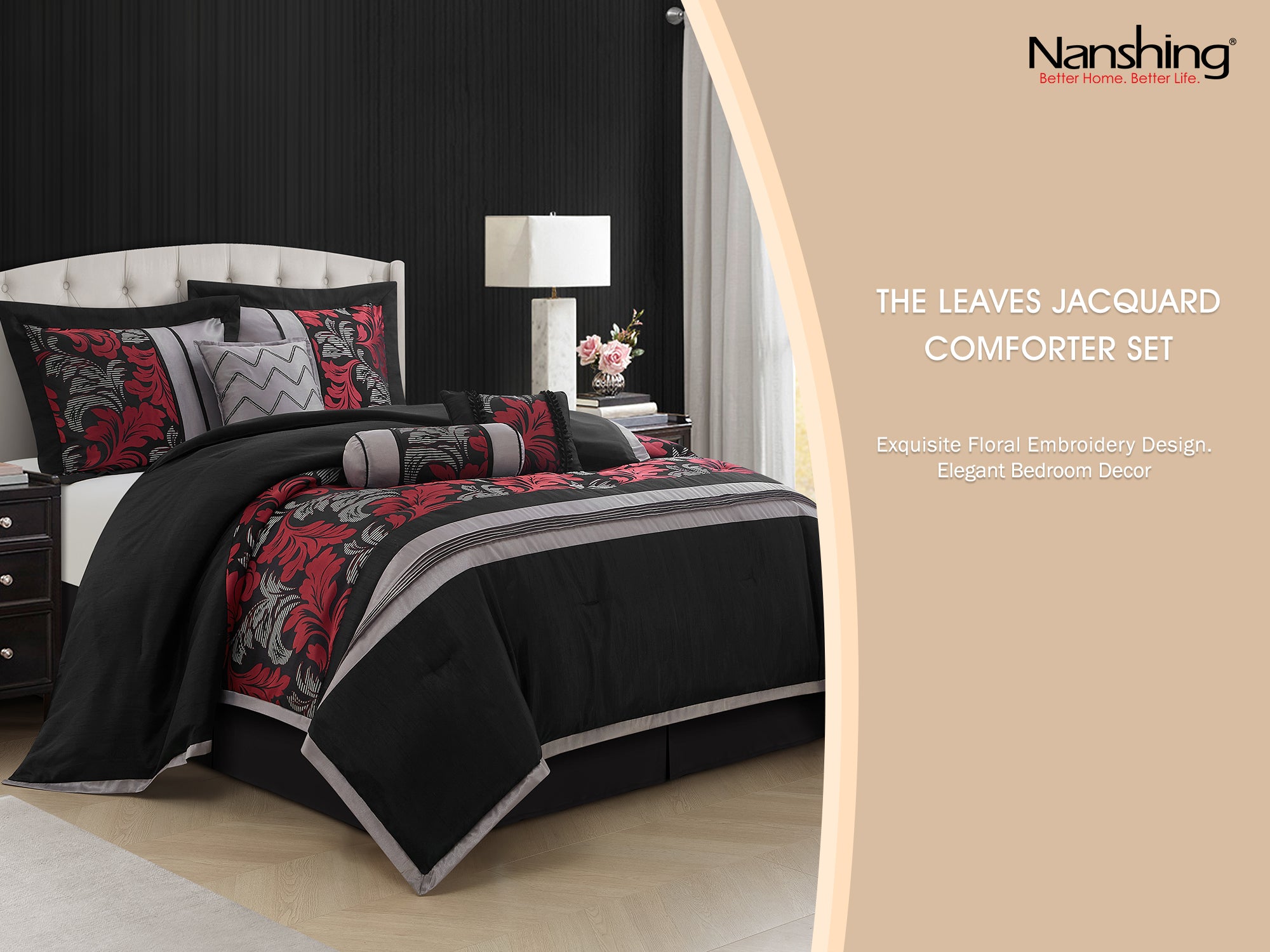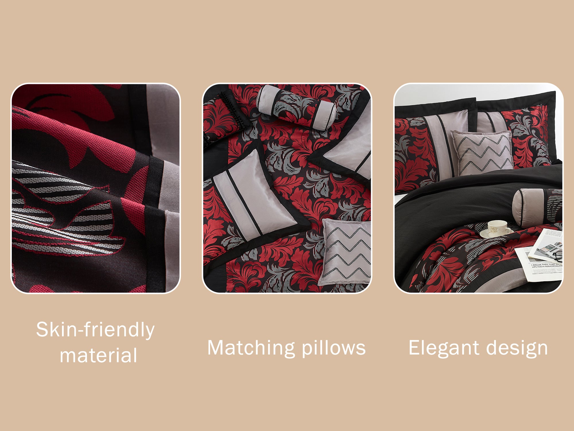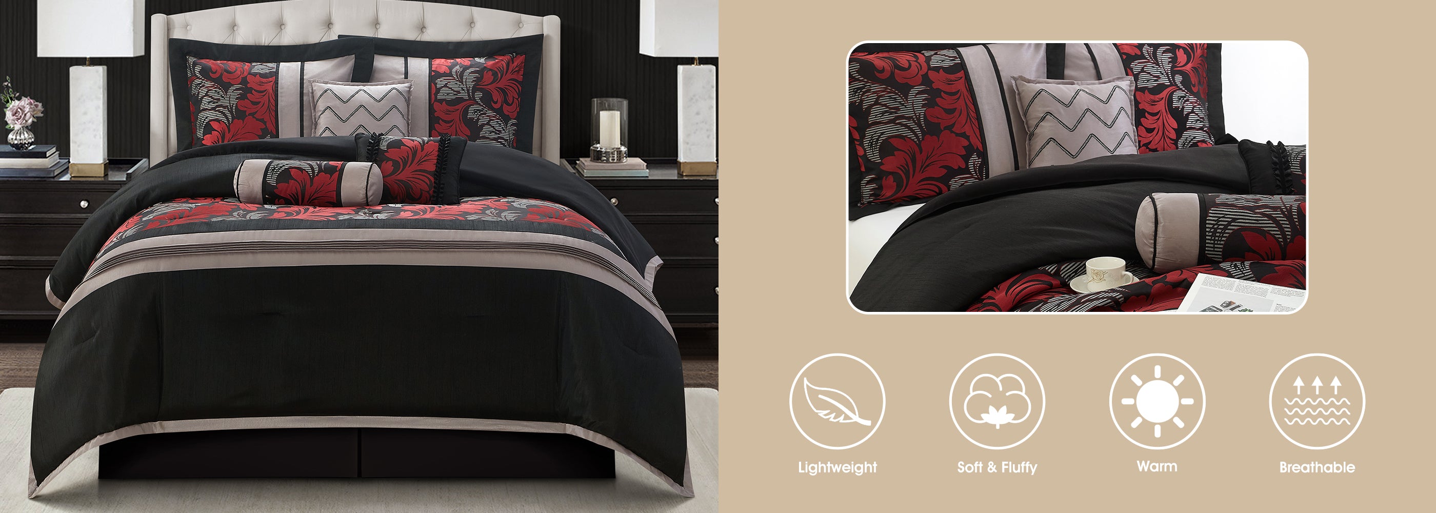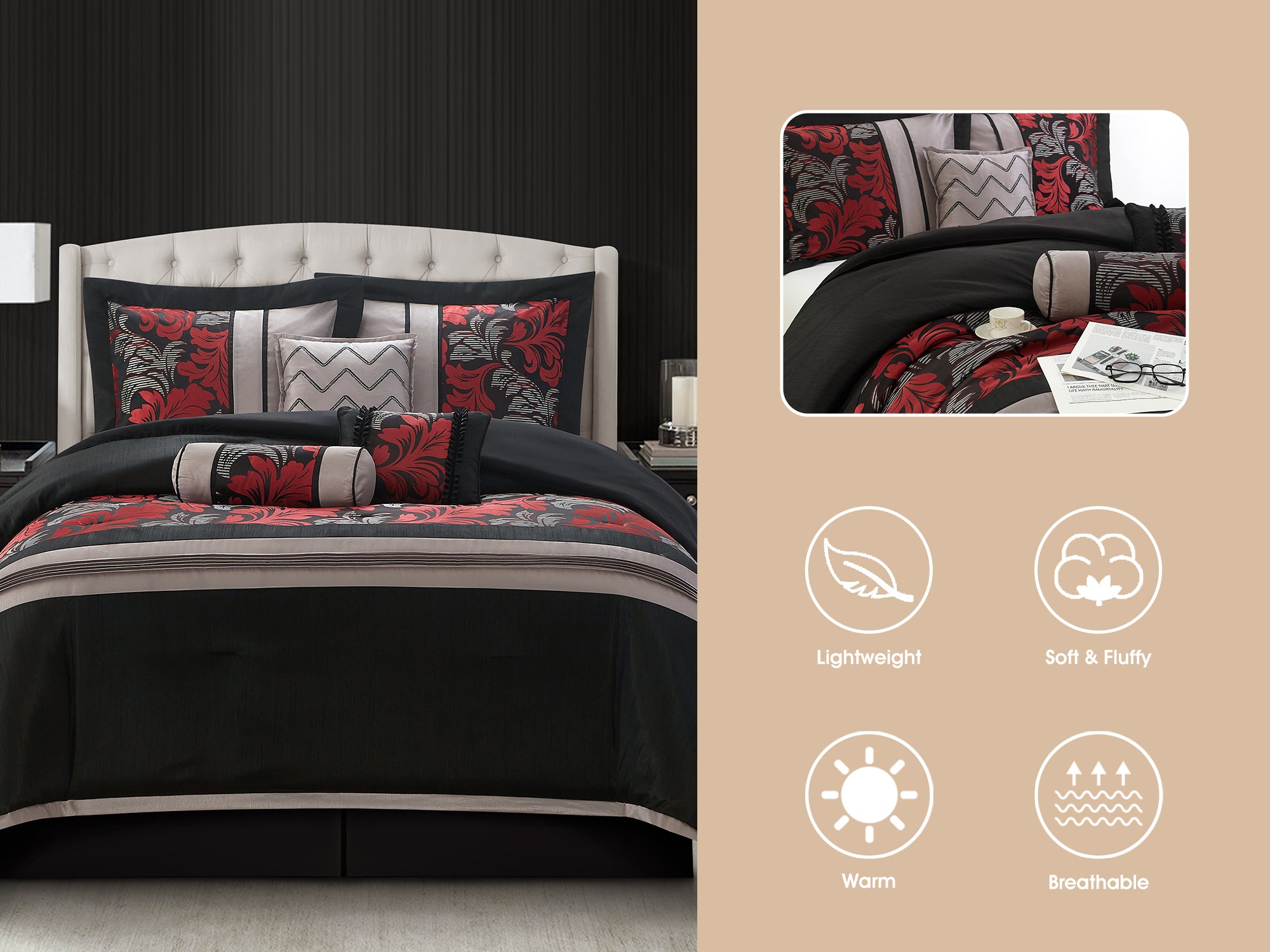 This beautiful 7-Piece bedding comforter set is an ideal way to meet all of your bedding needs in one convenient set. This set will help bring any room together. It is black with a red and gray leaf-like designs. Conveniently, this bedding set is available in Full, Queen, King and California King-sized mattresses. Each set includes one comforter, two shams, a bed skirt and three decorative pillows. The bed skirt has a 14 inch drop. The comforter and pillows contain a polyester fill for softness. This bedding set is ideal for anyone who likes a minimalist design with a dash of color. This set will help you complete your room's design, while also providing a comfortable place to sleep.