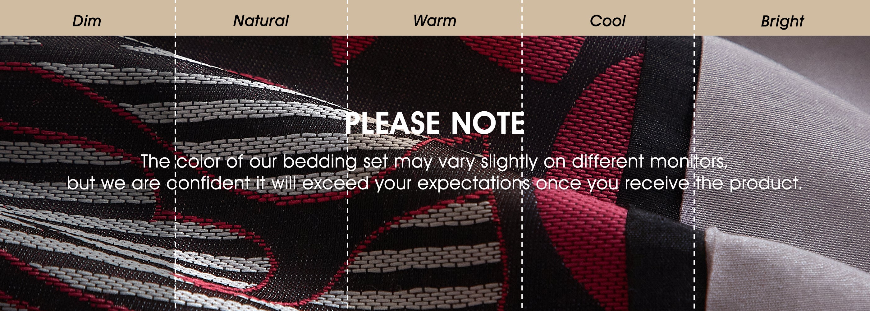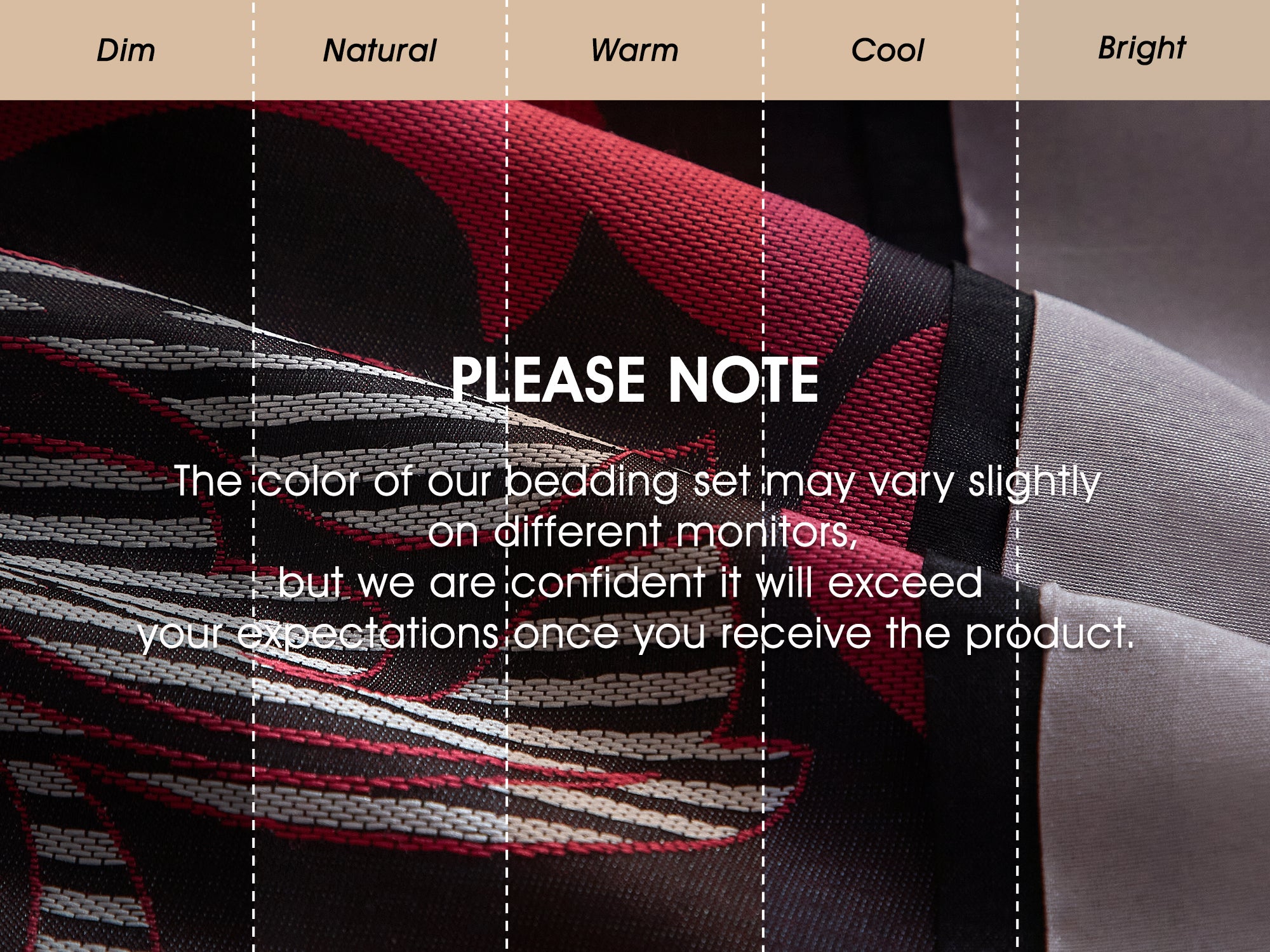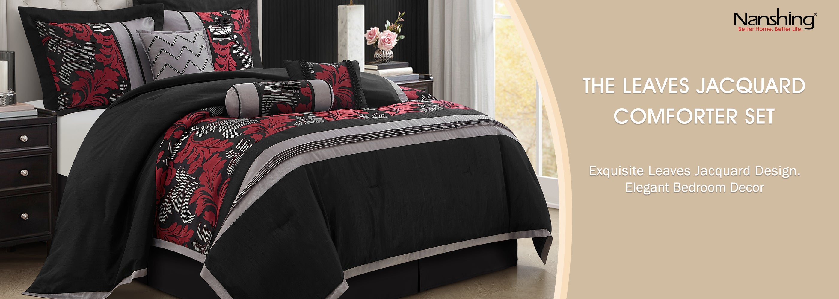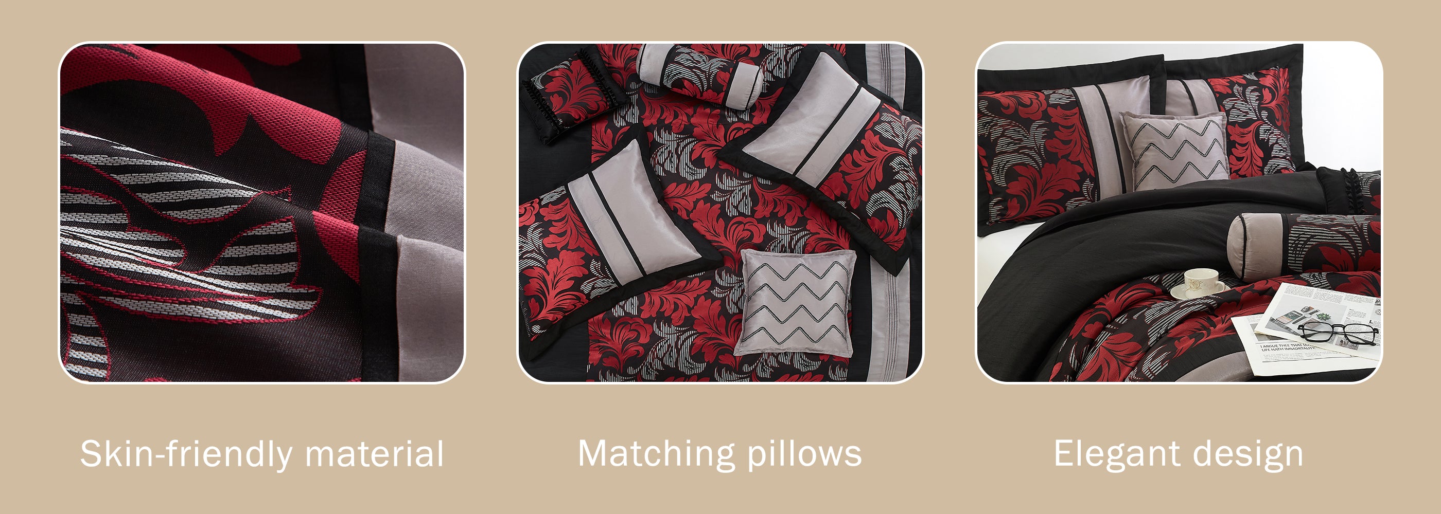 This beautiful 7-Piece bedding comforter set is an ideal way to meet all of your bedding needs in one convenient set. This set will help bring any room together. It is black with a red and gray leaf-like designs. Conveniently, this bedding set is available in Full, Queen, King and California King-sized mattresses. Each set includes one comforter, two shams, a bed skirt and three decorative pillows. The bed skirt has a 14 inch drop. The comforter and pillows contain a polyester fill for softness. This bedding set is ideal for anyone who likes a minimalist design with a dash of color. This set will help you complete your room's design, while also providing a comfortable place to sleep.