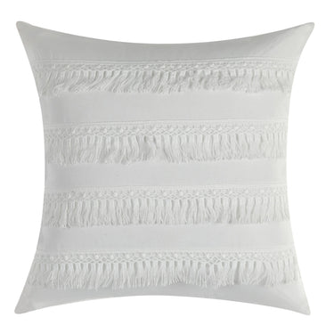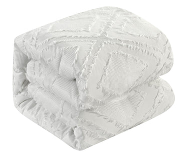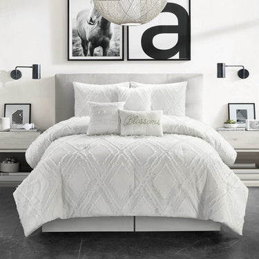 Spruce up your master suite with the enchanting appeal of this 7-piece comforter set. The comfy comforter and shams flaunt exquisite embroidery in white velvety fabric for a simple yet elegant look. With a polyester microfiber design, this comforter set includes one (1) comforter, two (2) shams, one (1) bed skirt, and three (3) decorative pillows. One of the pillows features metallic typography that adds to the alluring charm of the set. Soft to the touch and long-lasting, this bed set can be machine washed for a better snuggle.
