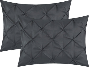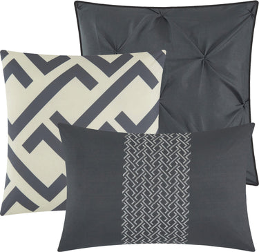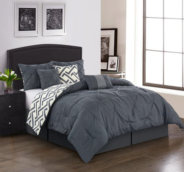Refresh any bedroom with this beautiful comforter 7-Piece set. This stylish ensemble features a fully reversible comforter. The solid side is adorned with edge to edge pin tucks and the reverse side a modern geometric print. This set also includes two shams, three coordinating decorative pillows, and a bed skirt to finish this look and create your restful retreat.