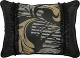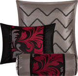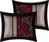 This beautiful 7-Piece bedding comforter set is an ideal way to meet all of your bedding needs in one convenient set. This set will help bring any room together. It is black with a red and gray leaf-like designs. Conveniently, this bedding set is available in Full, Queen, King and California King-sized mattresses. Each set includes one comforter, two shams, a bed skirt and three decorative pillows. The bed skirt has a 14 inch drop. The comforter and pillows contain a polyester fill for softness. This bedding set is ideal for anyone who likes a minimalist design with a dash of color. This set will help you complete your room's design, while also providing a comfortable place to sleep.