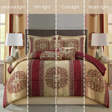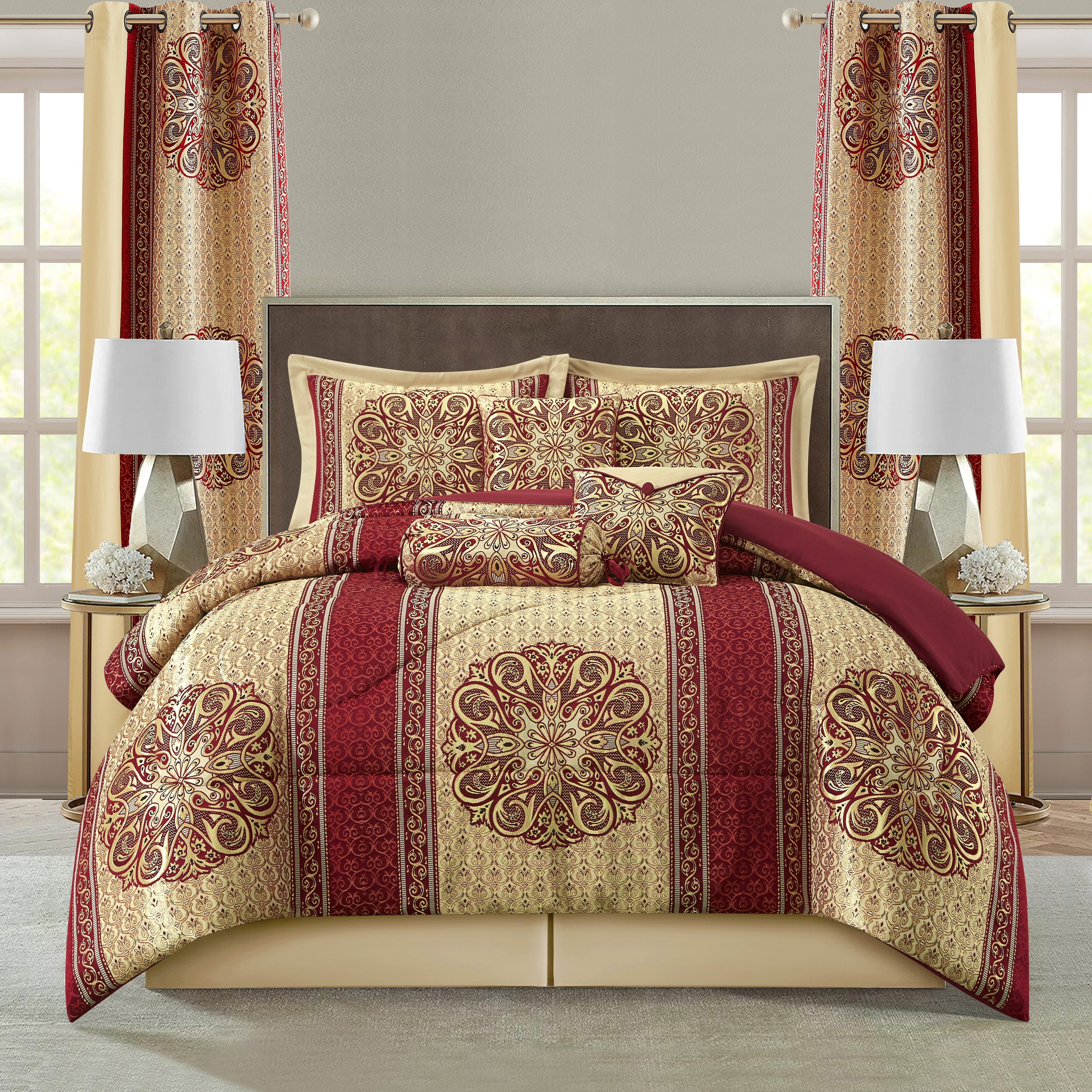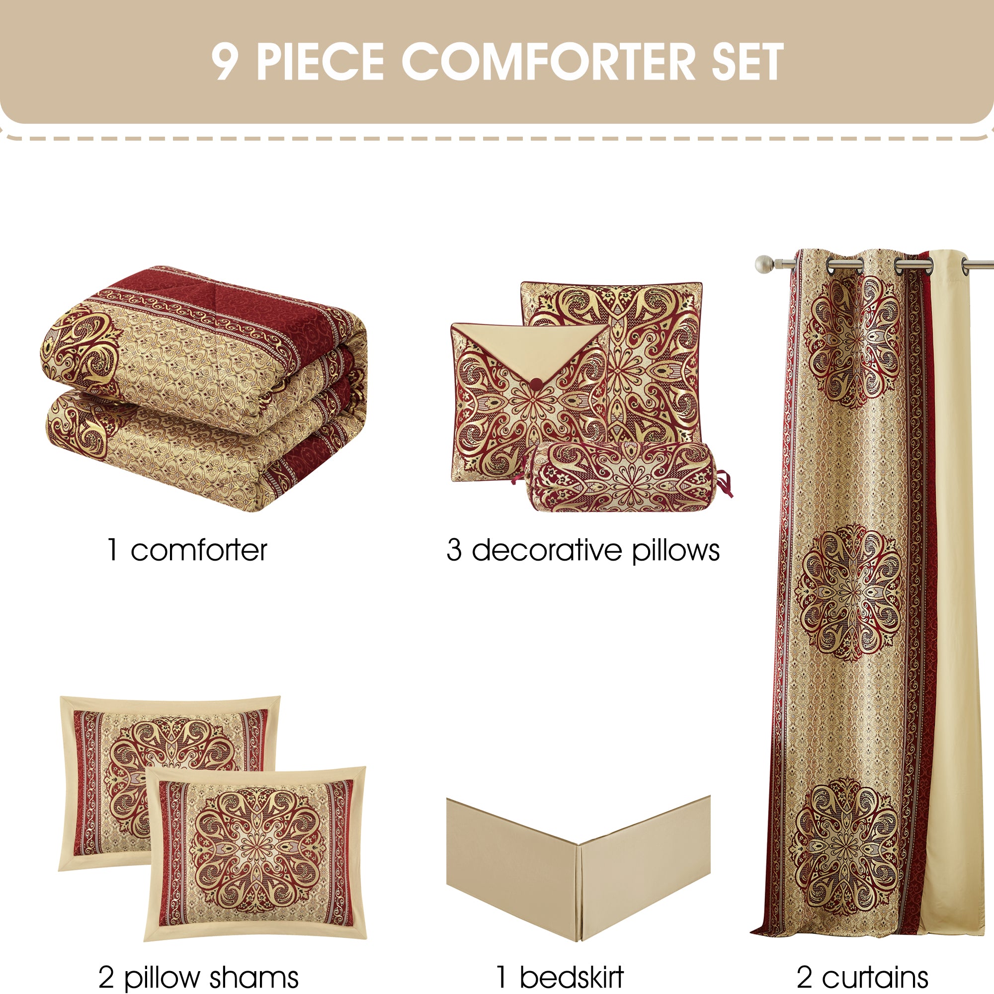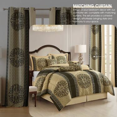 Set Includes: (1) Comforter, (2) Pillow Shams, (1) Bed skirt, (3) Decorative Pillows, (2) Curtains