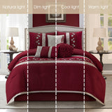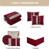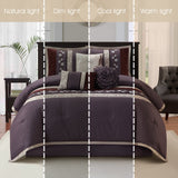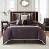 Rich and feminine, this beautiful purple 7-Piece comforter set is luxury fit for any lady's bedroom. A comforter, bed skirt, shams, and three accent pillows, crafted with polyester fabric, are included in this set. The comforter boasts a tailored banded design with flocked vine and embroidered floral prints in lilac and silver hues. Both prints, and a flourish of ruffles, are echoed on the bordered shams and toss pillows.